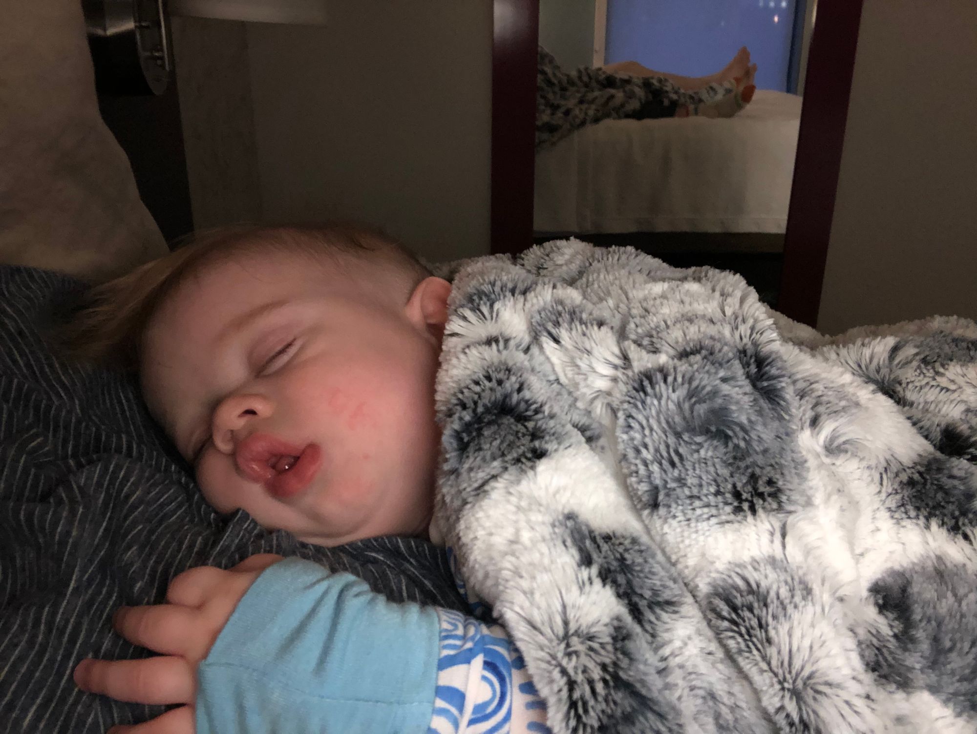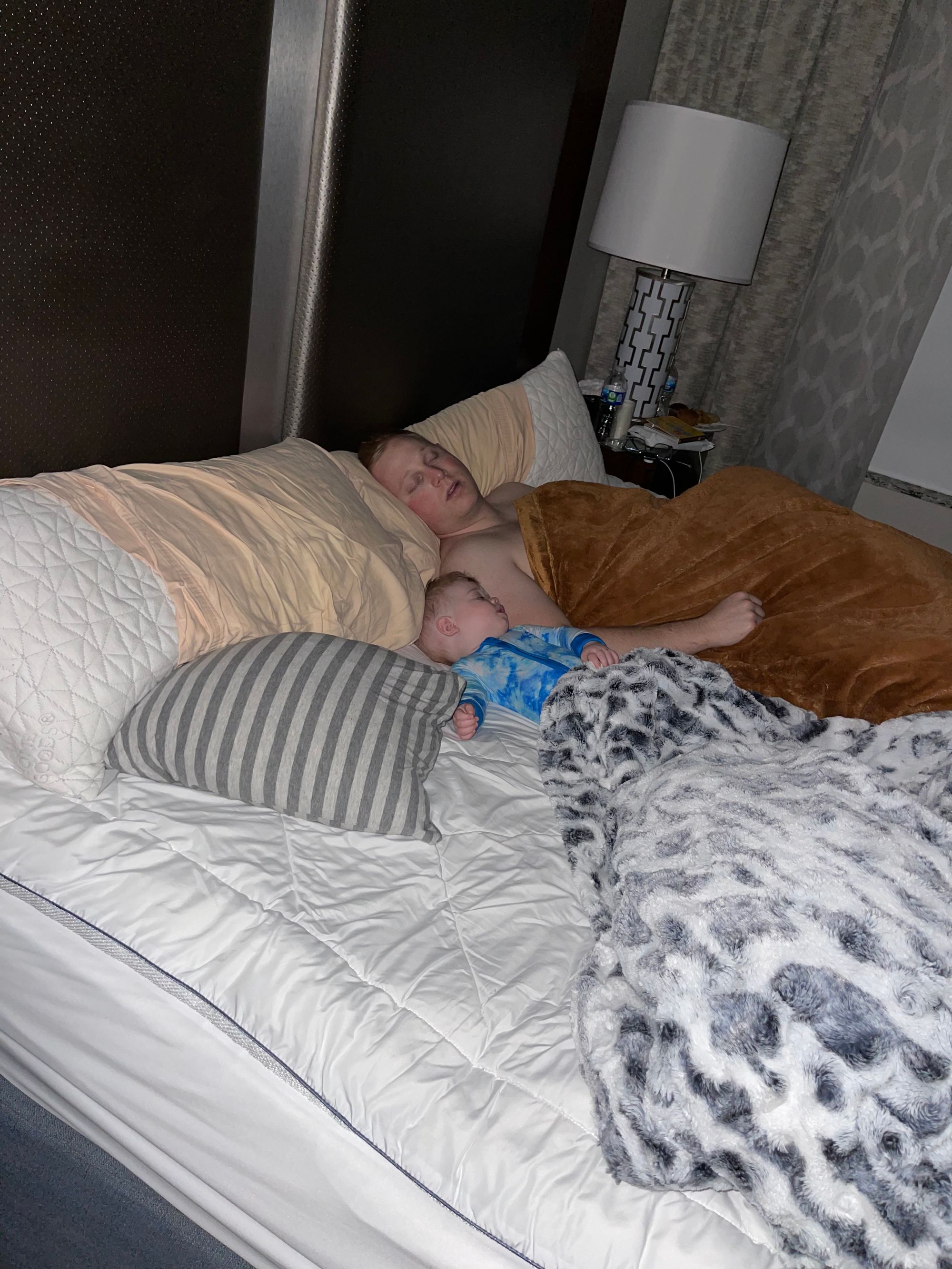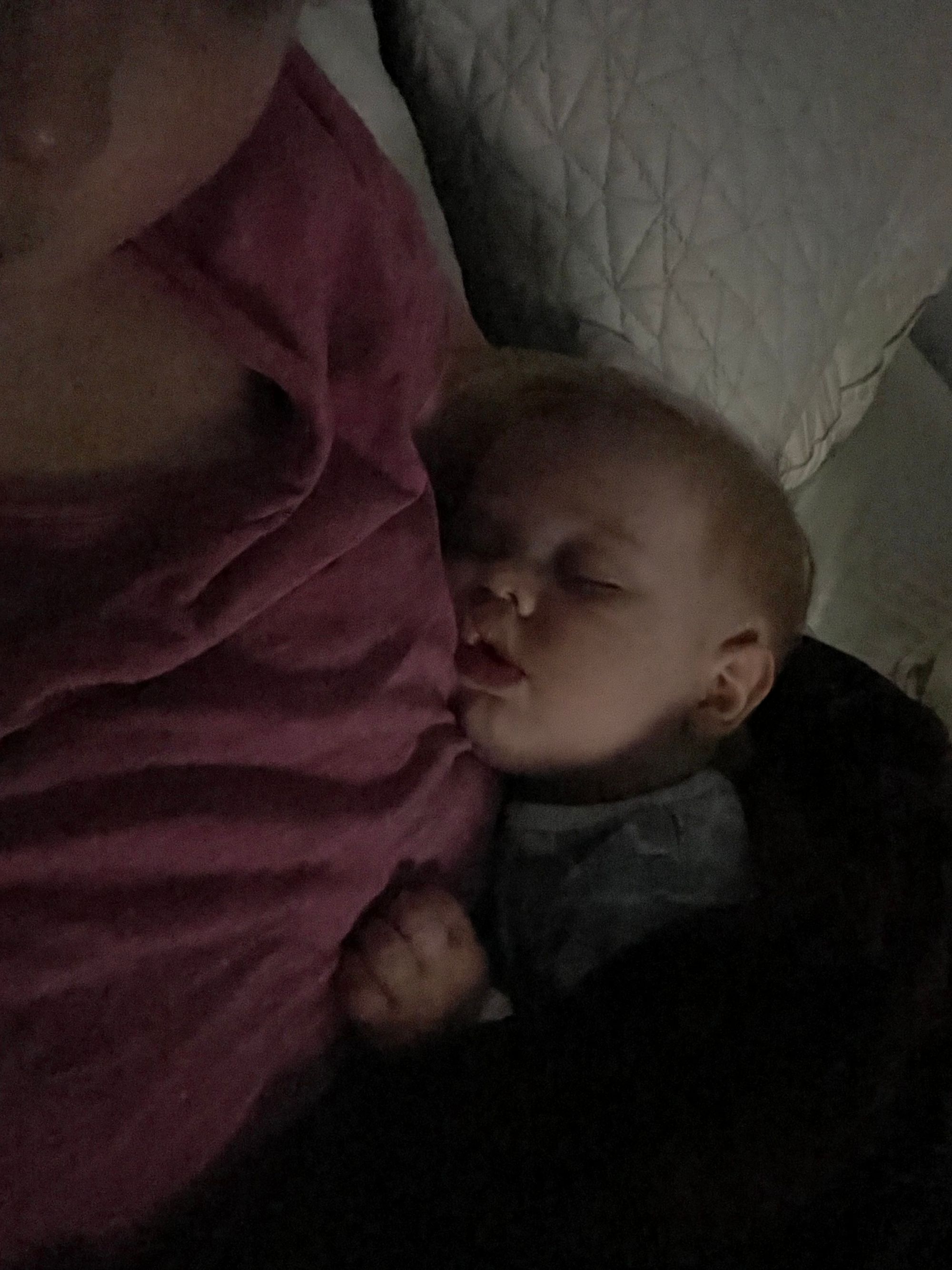 He's literally slept in my arms or next to me every single night of his life. I've spent many nights sleeping in a recliner, propped up in bed, whatever it took. We've moved a queen bed into our room next to our king bed to provide extra space at times, we've taken down our bedframe and placed our mattress on the floor, I know this won't last long so I am taking everything I can get.