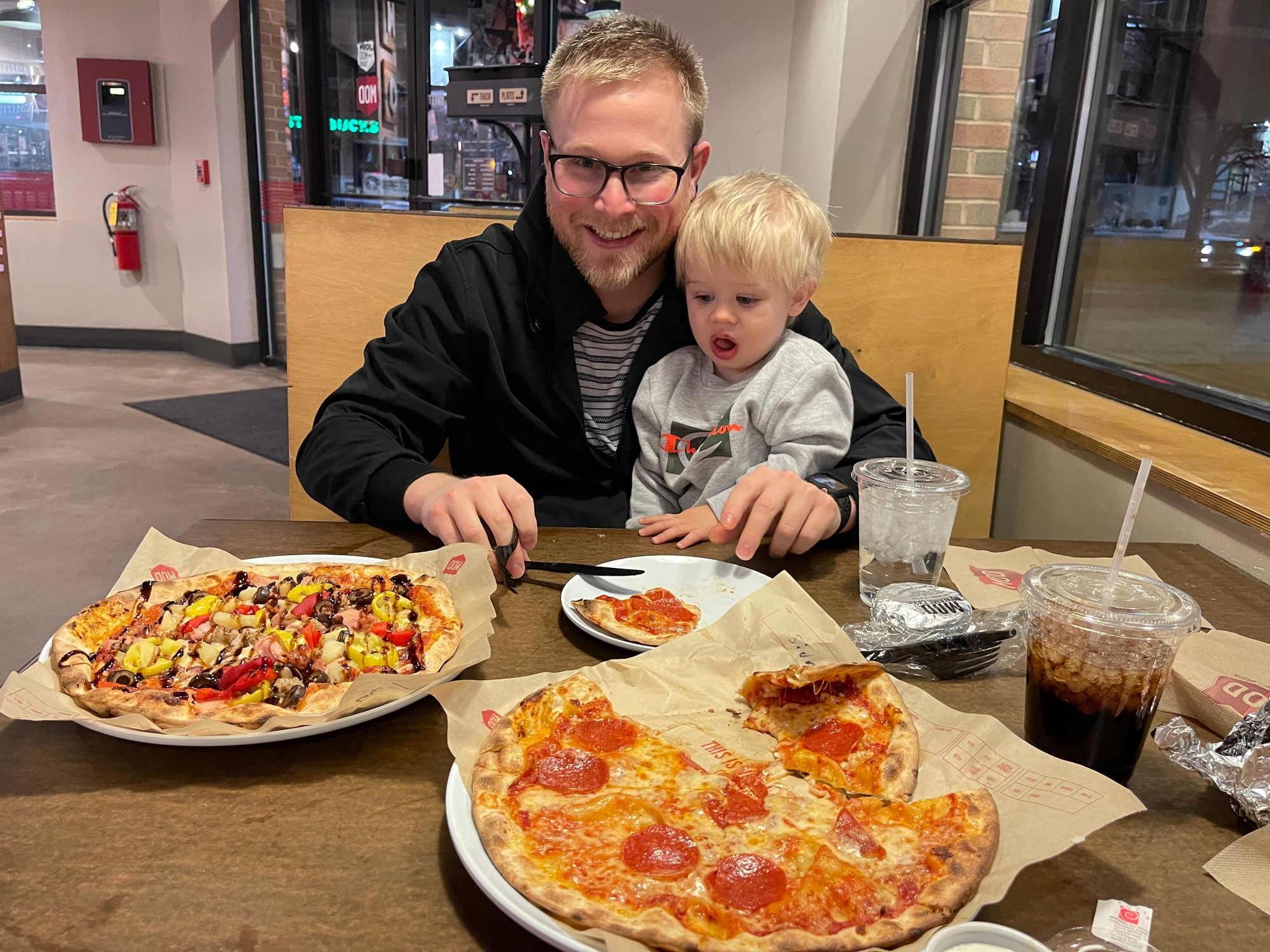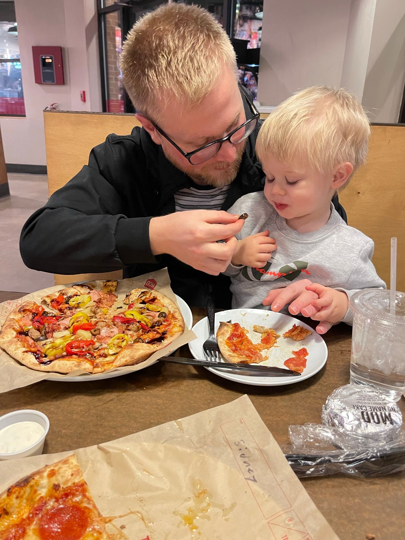 We went to MOD Pizza for dinner and Benson was LOVING the toppings on Logan's pizza. It still shocks me how well he eats.