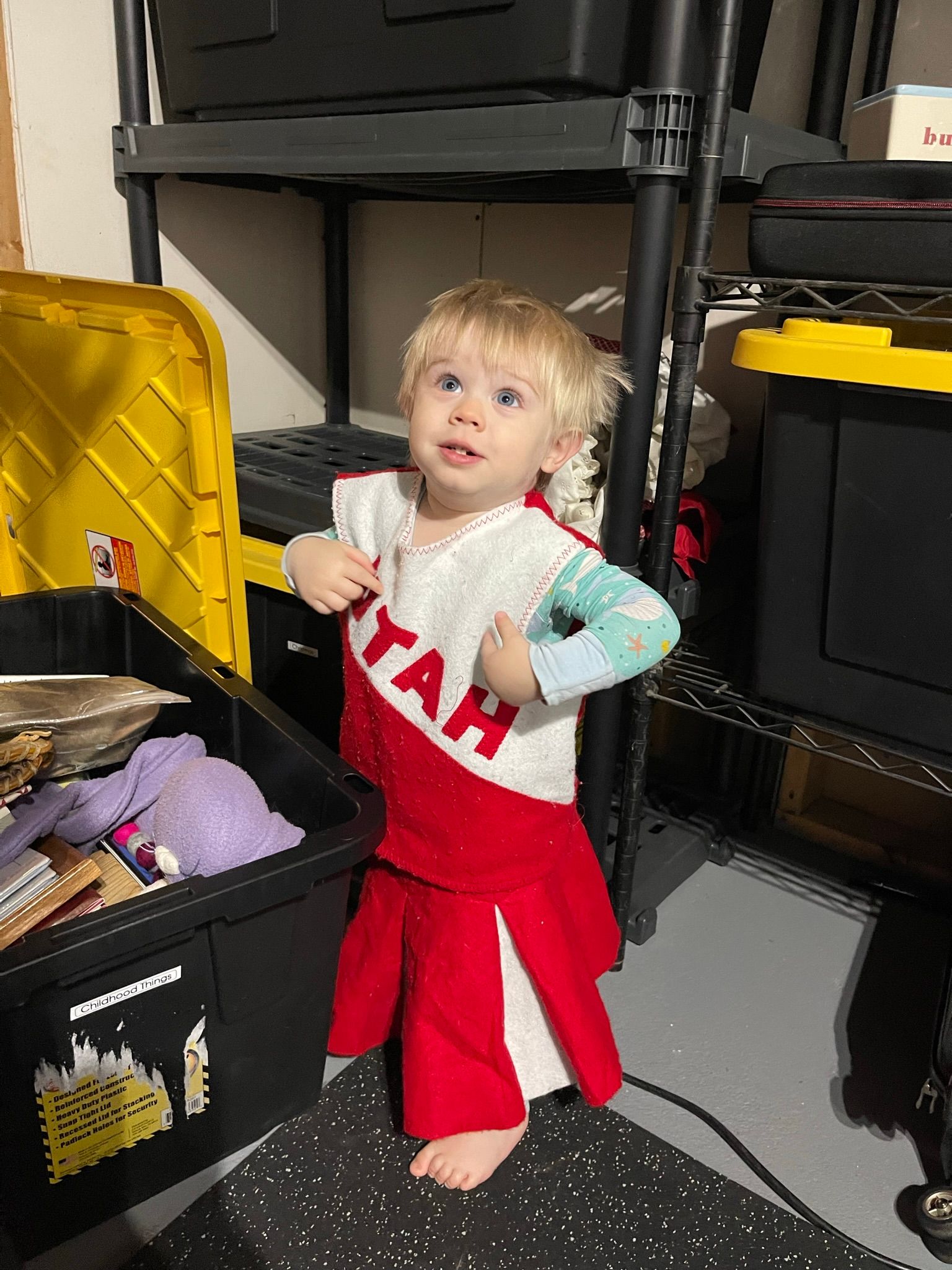 How cute and funny is this? An old Halloween costume of mine. My mom made all three of us girls matching Utah cheerleading uniforms. We even went to the Target photo studio and got pictures taken in them.