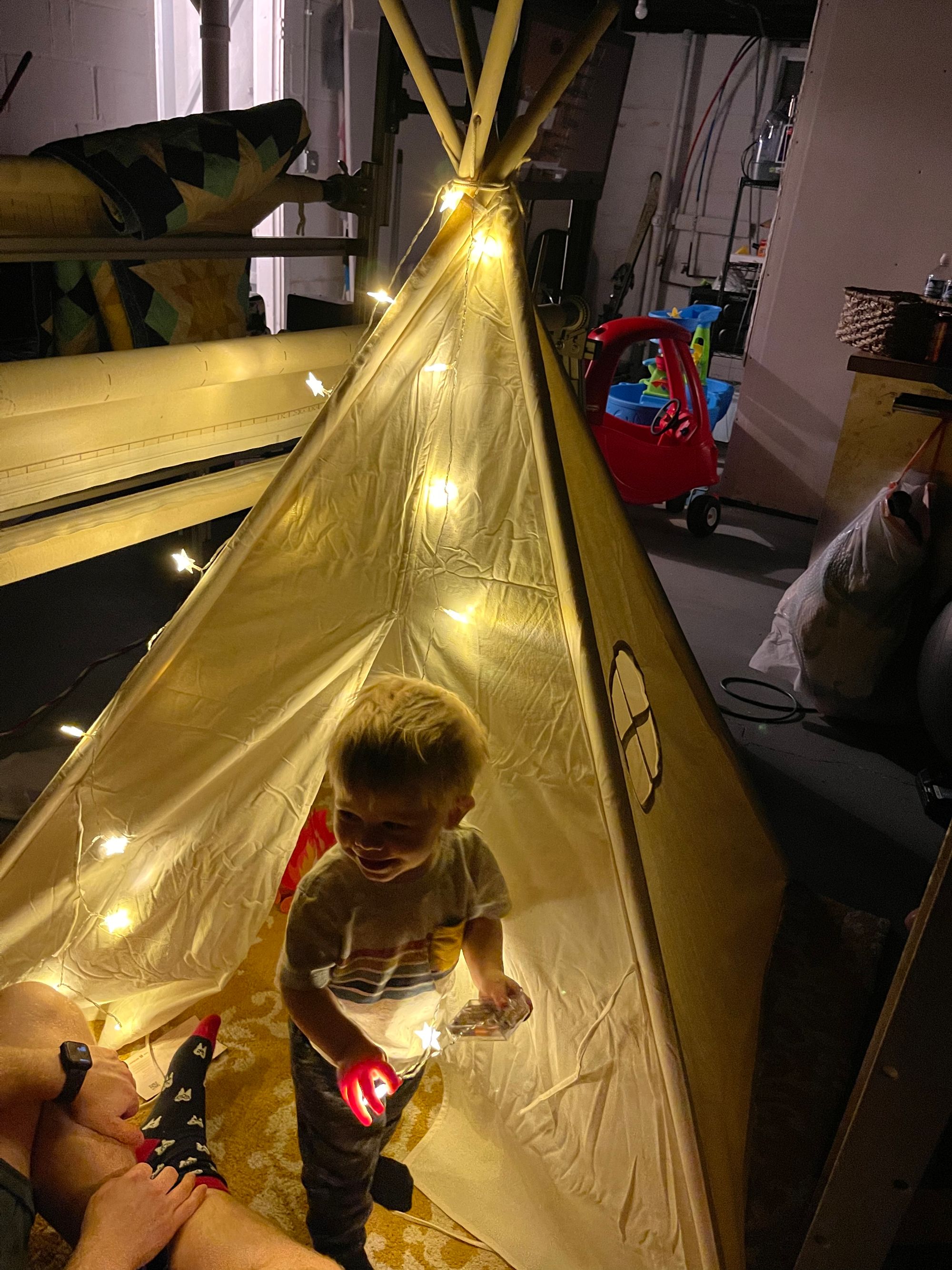 This kid has had Christmas presents showing up nonstop! We've opted to open most of them and he has been loving it. Aunt Katie sent this awesome Teepee!