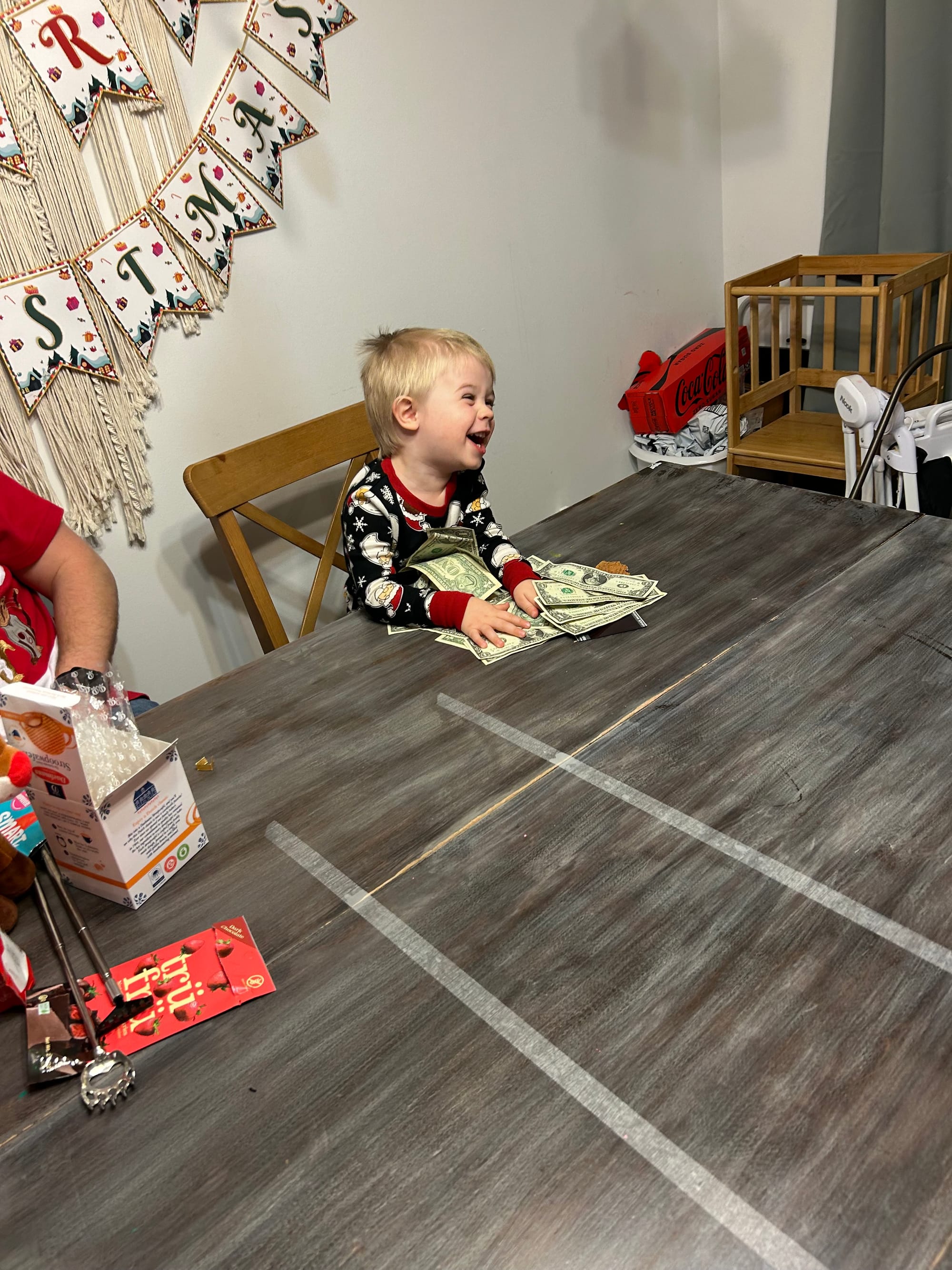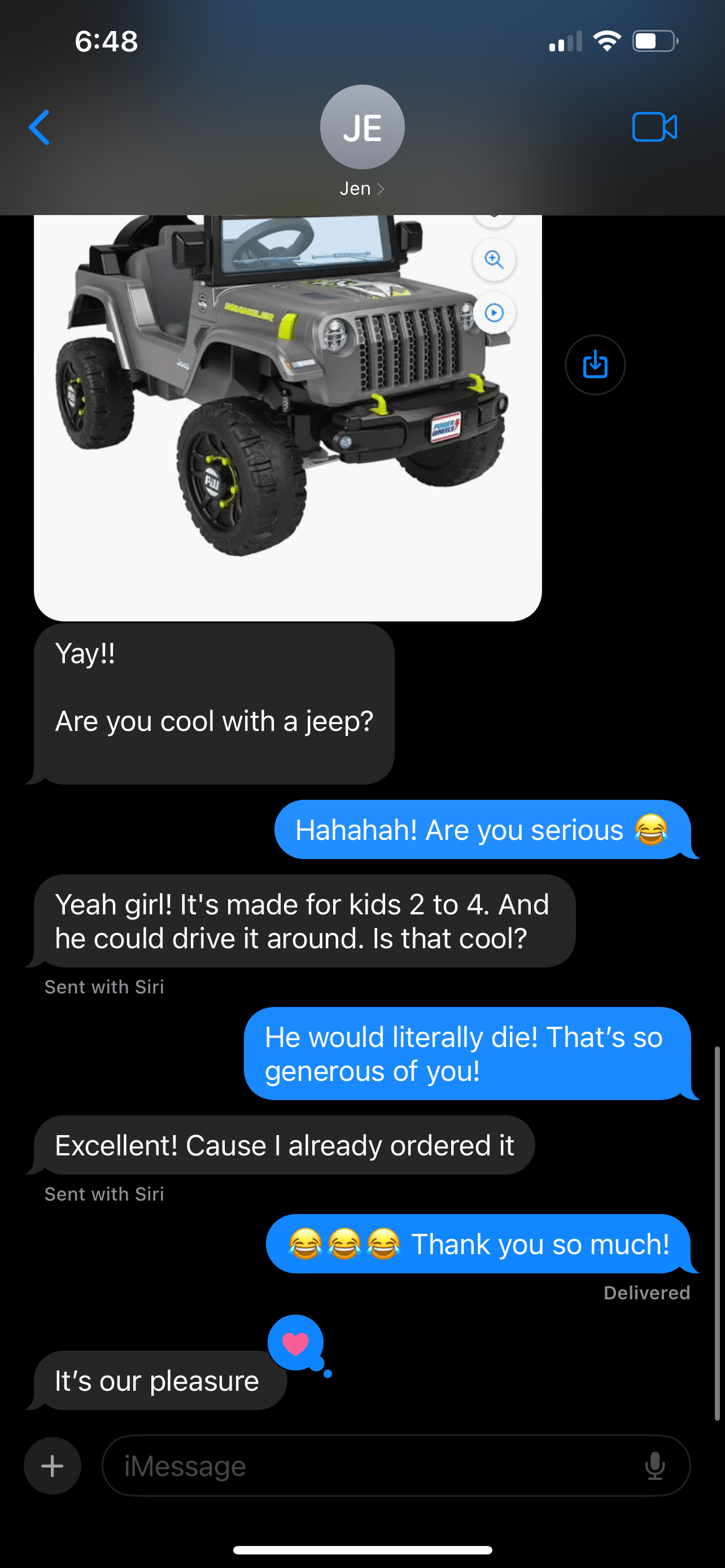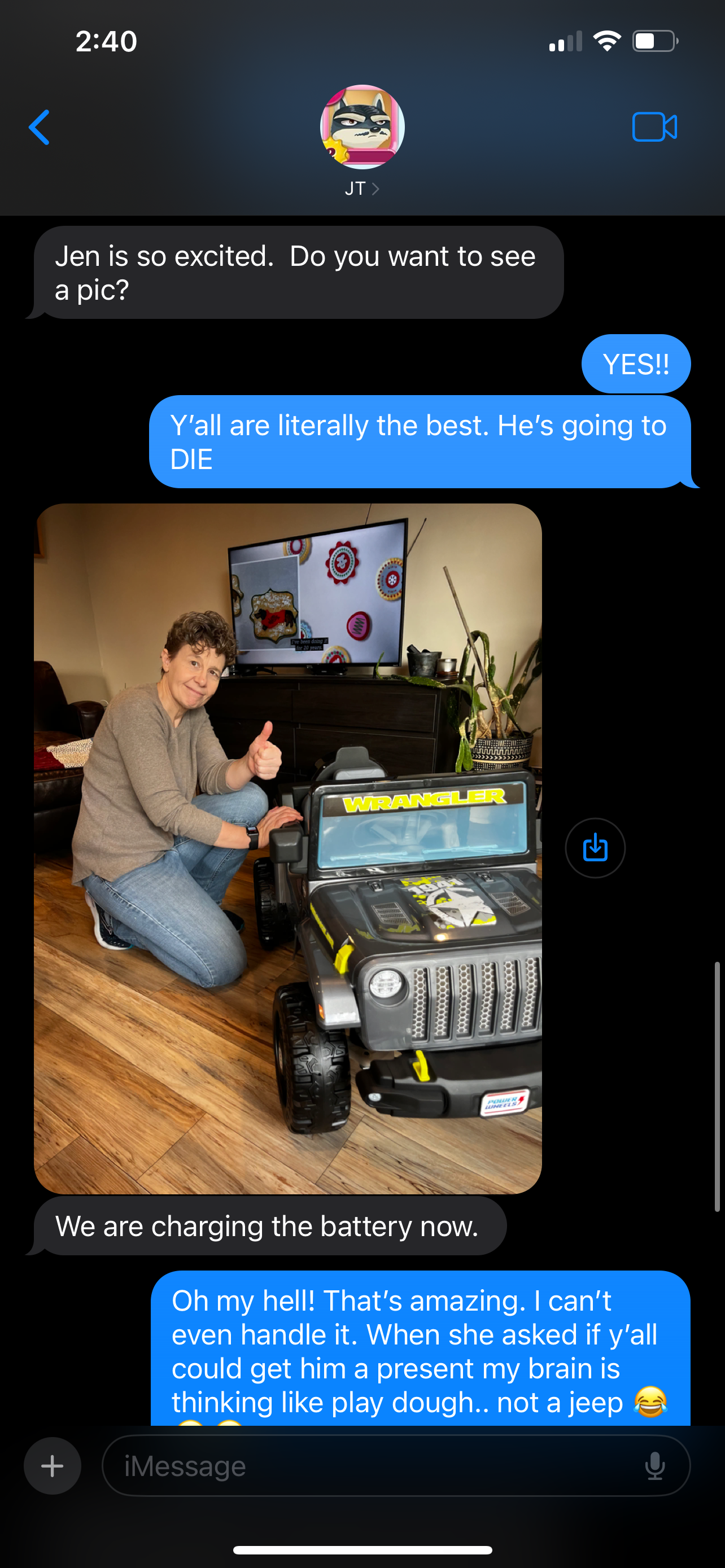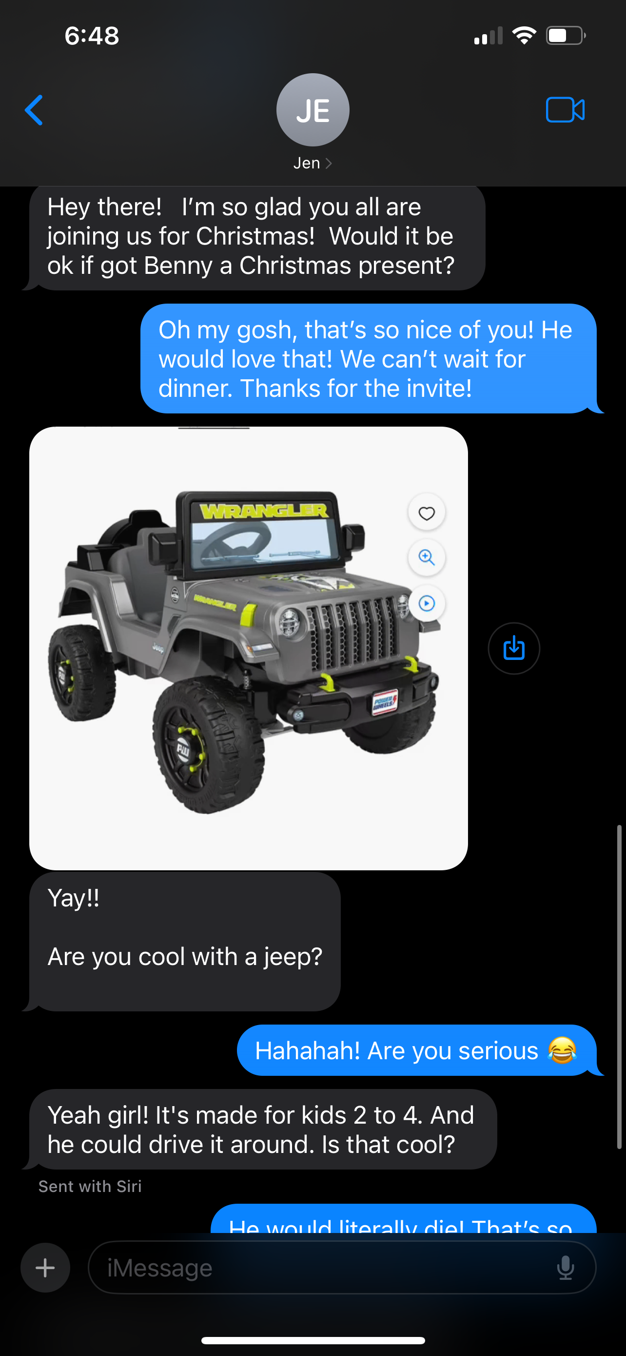 JT and Jen invited us over for Christmas Day dinner. A few days before Jen texted me asking if they could get Benson a Christmas present. Of course I said yes, but was shocked by our text exchange!