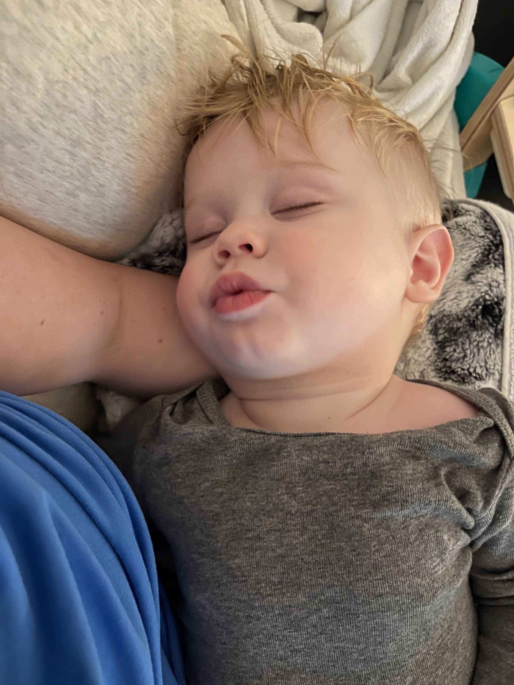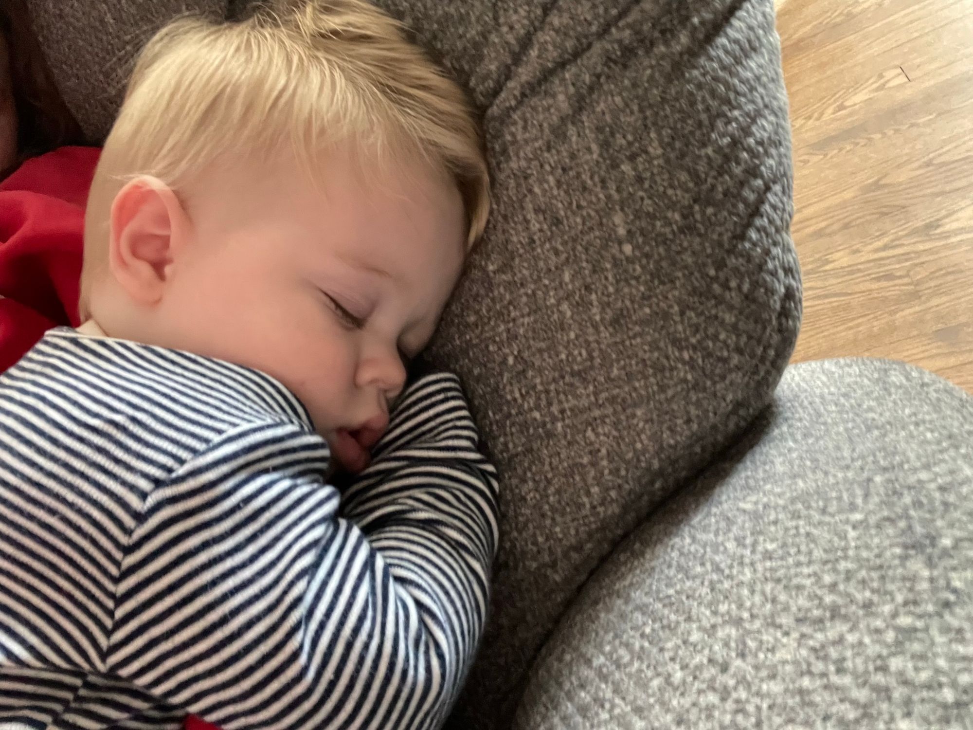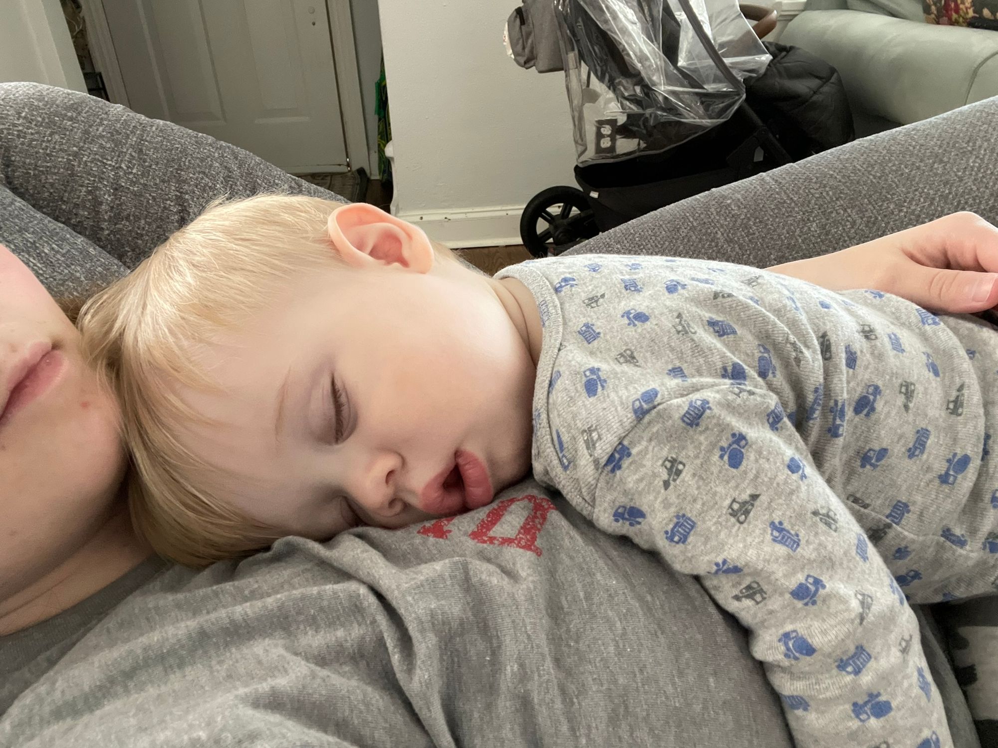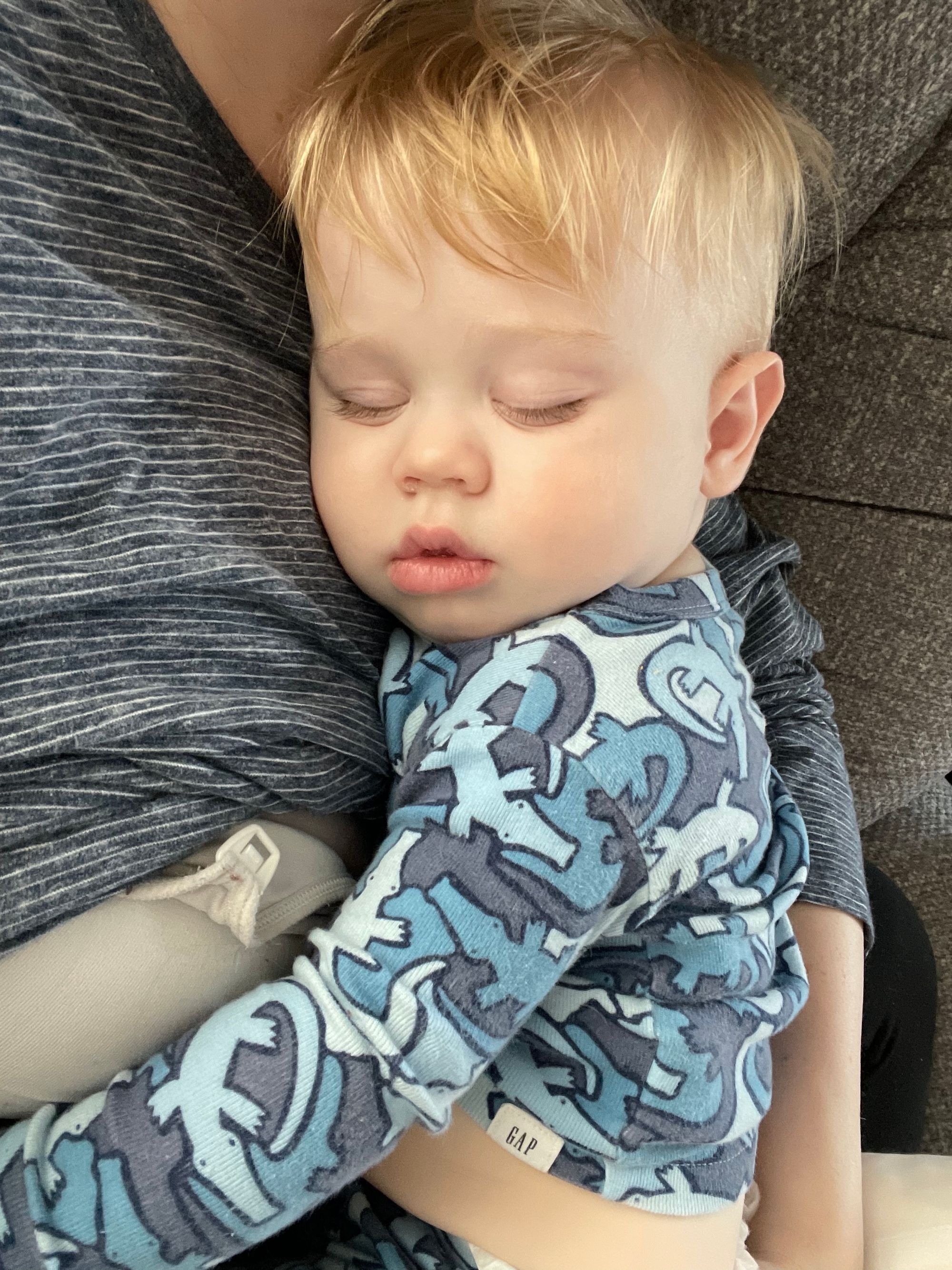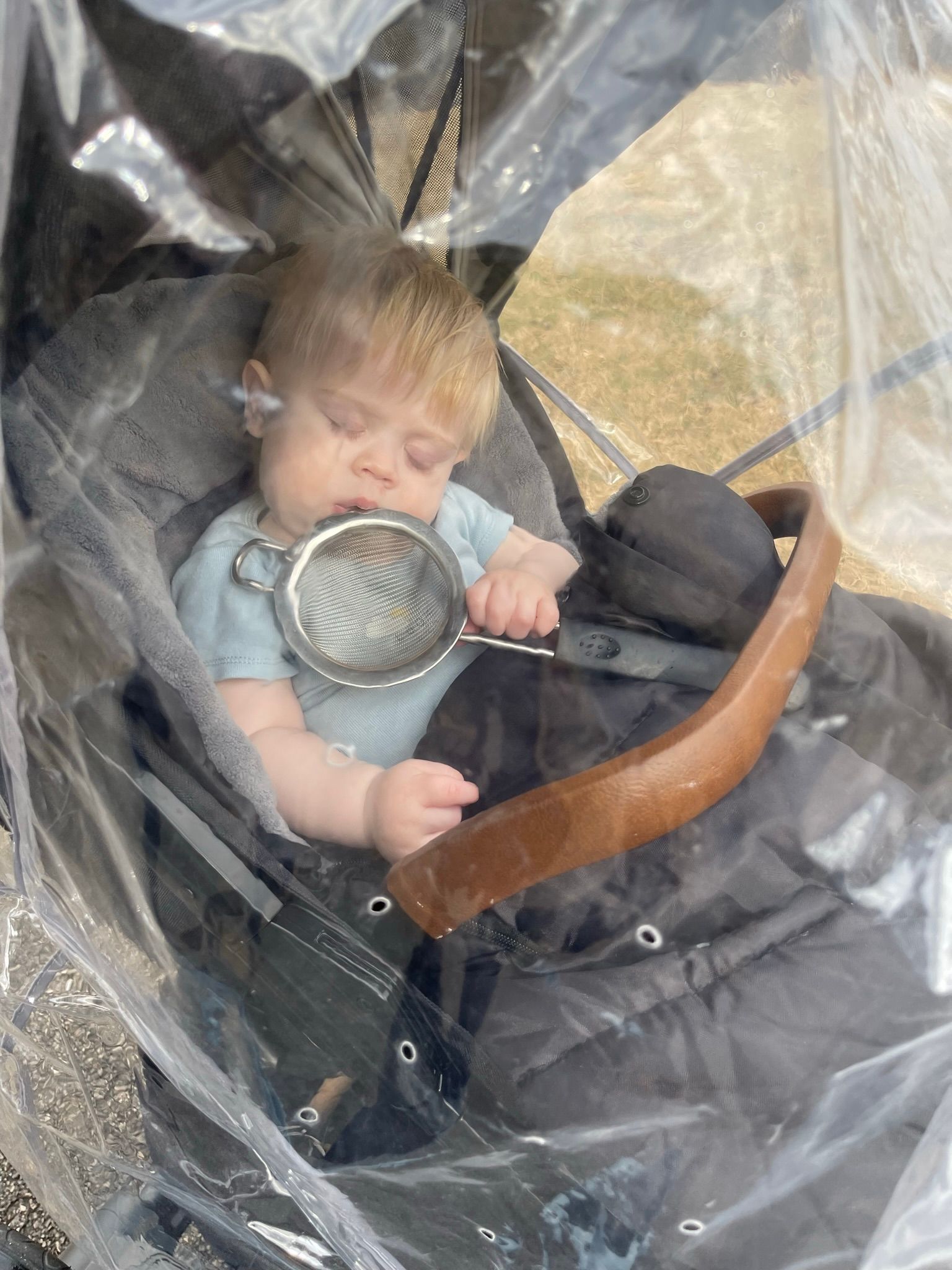 Benson fell asleep on our walk today with this strainer in his hand - I thought it was hilarious!