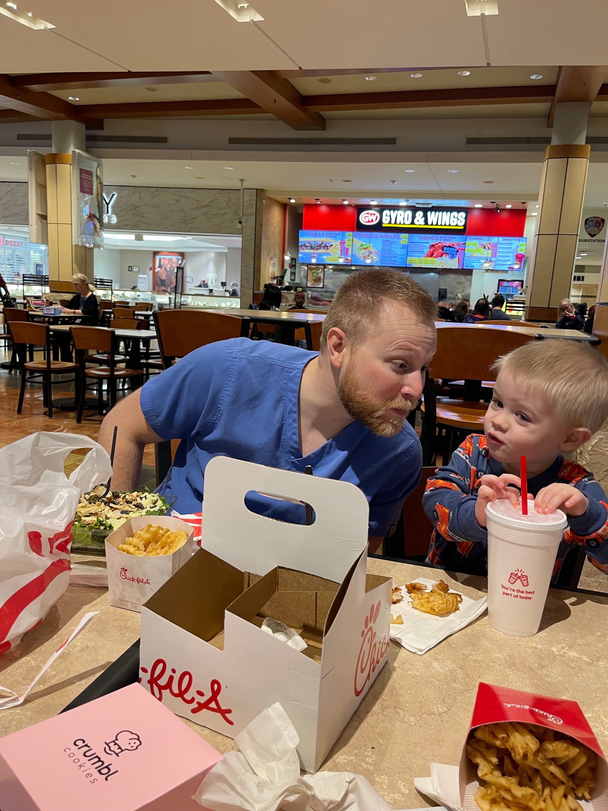 February 1st we had a 50th birthday celebration for my dad planned. Benson and I needed some mint ice cream for the party so we went to Trader Joe’s. Logan was done with school so he decided to meet us for lunch. I ordered us ChickFila… only to realize I ordered it at the wrong location…. Inside the mall! Ah!