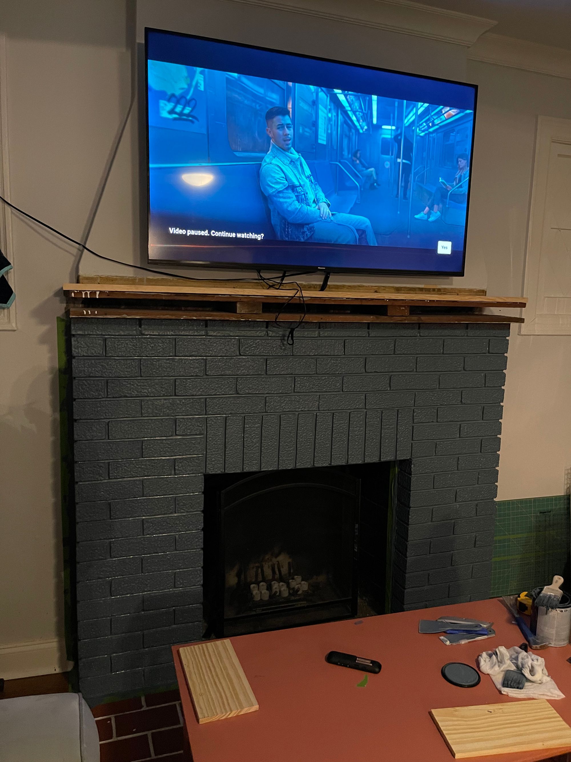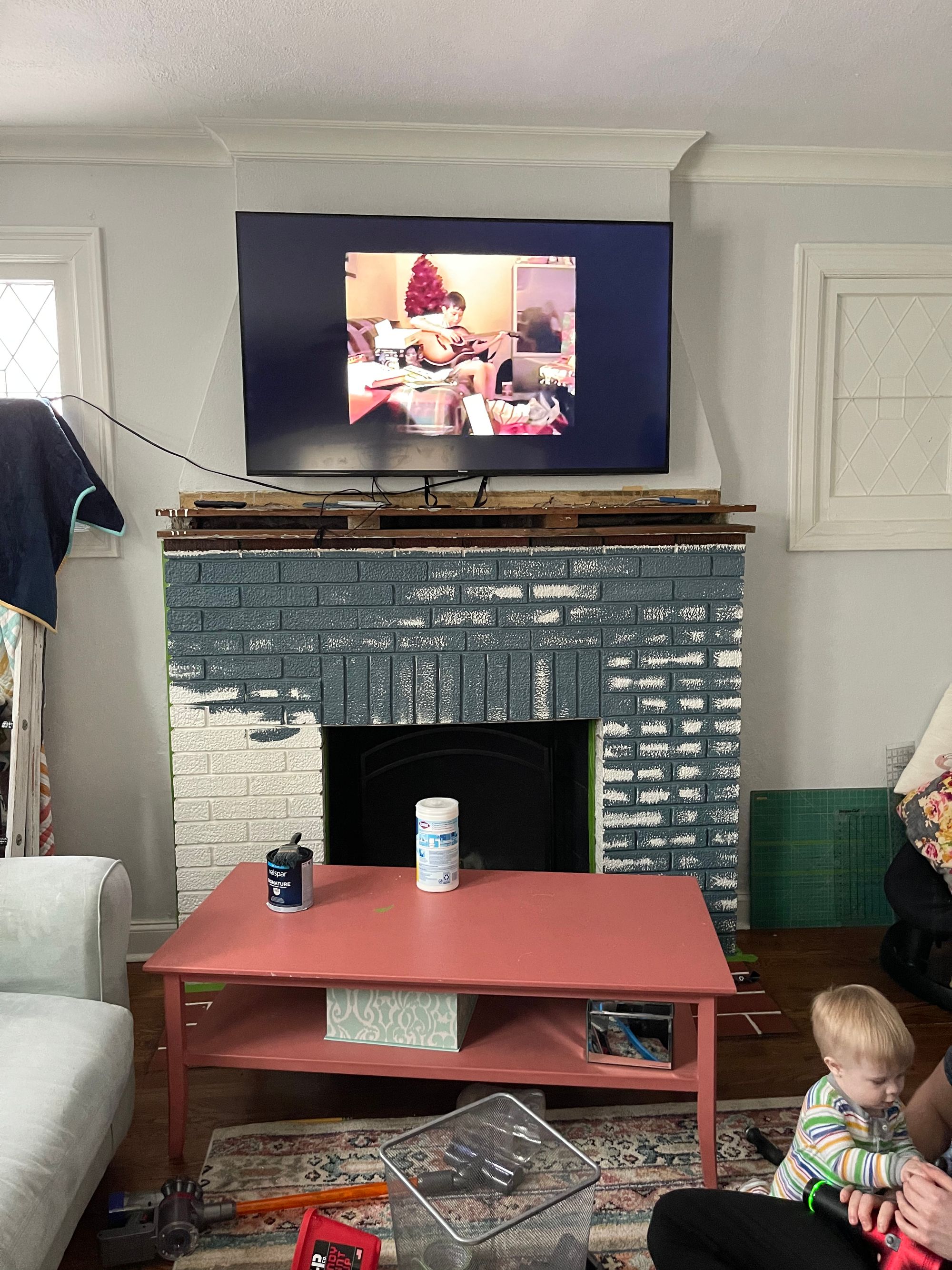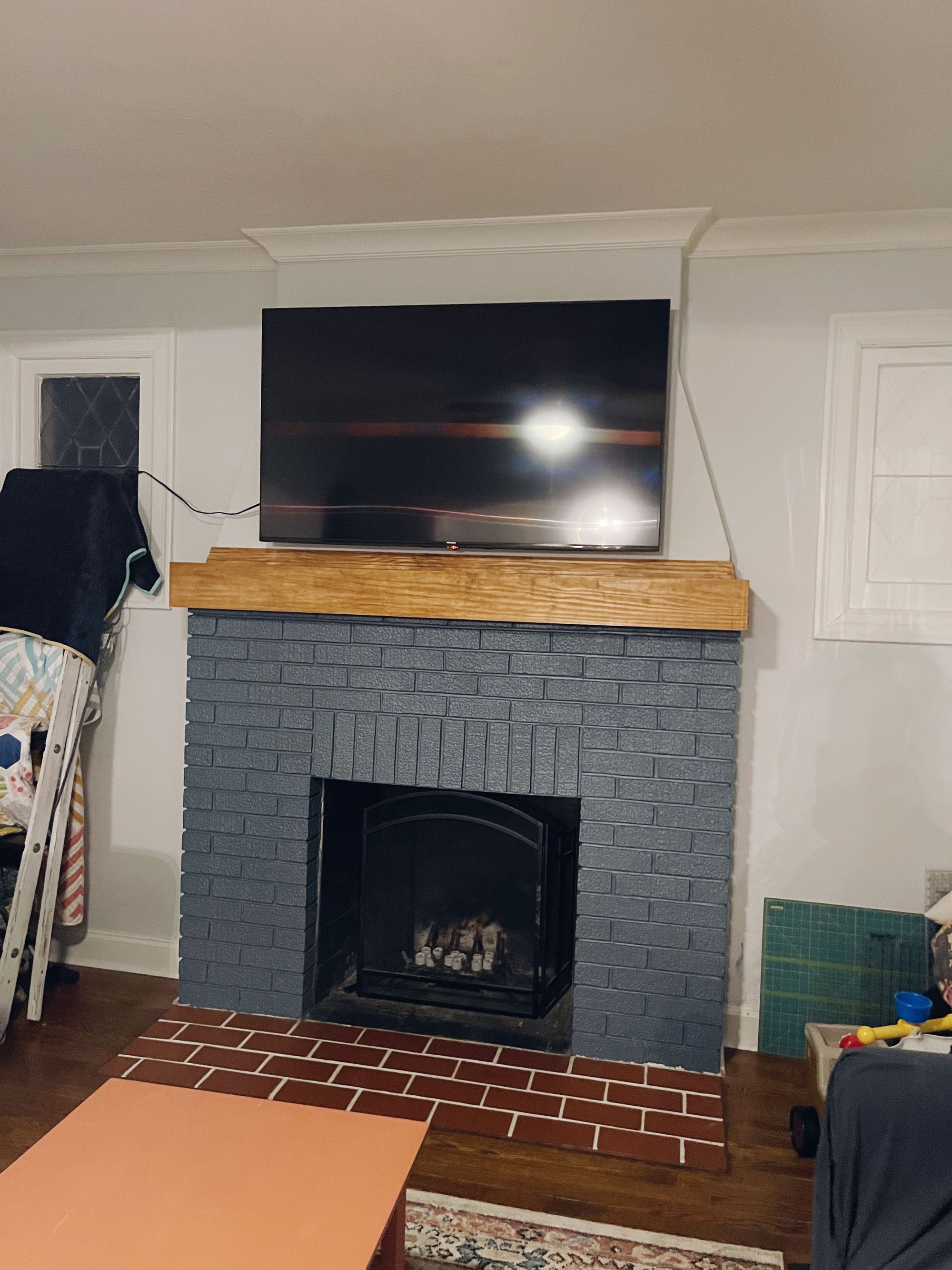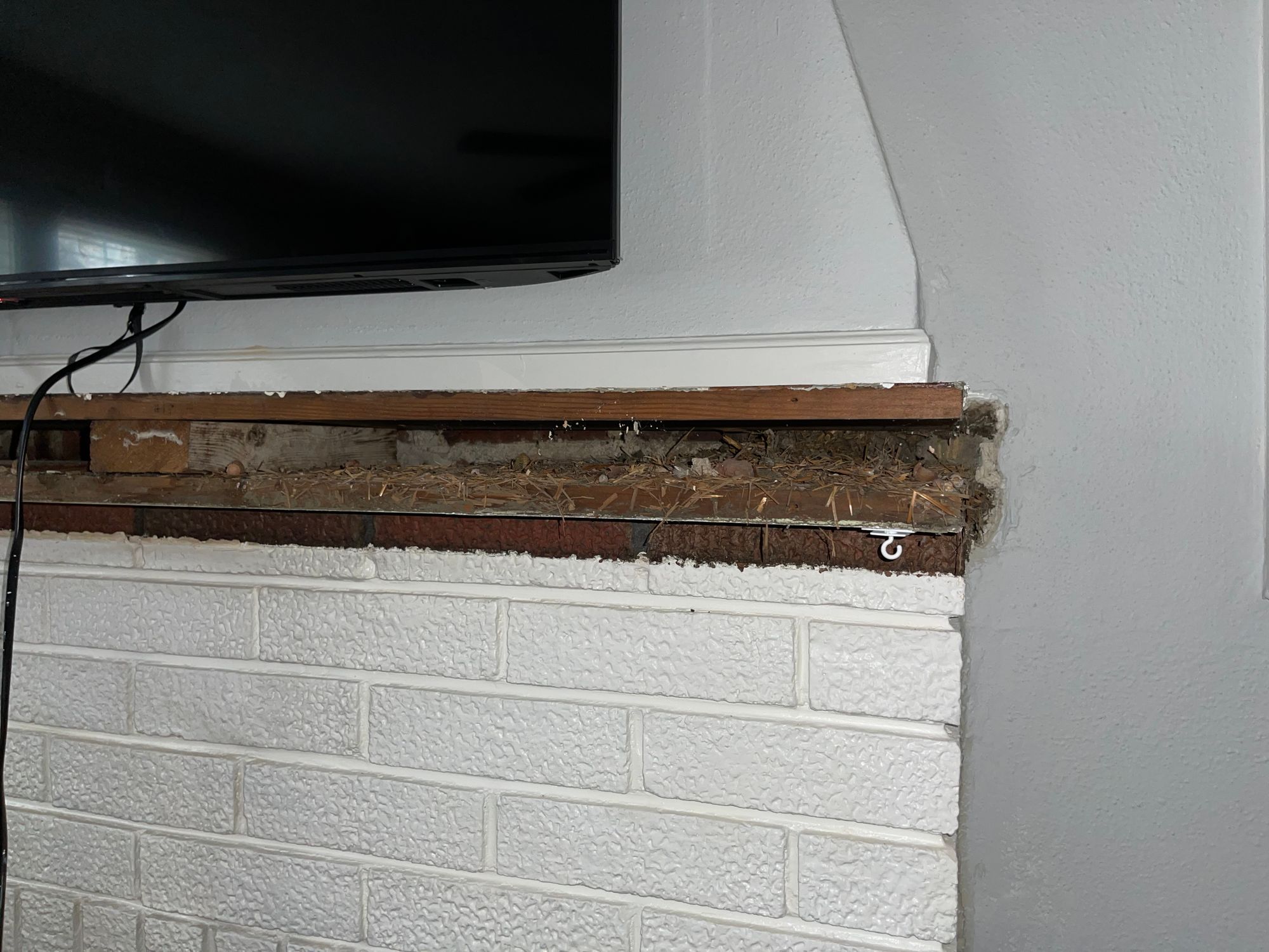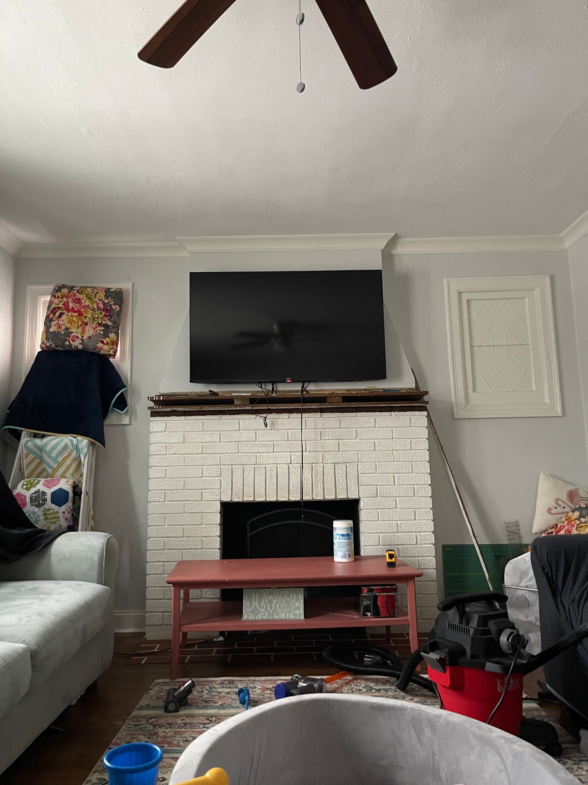 This sparked an idea to look at the fireplace mantle. The paint has been bubbling and chipping all over. They did not prepare anything correctly before painting over it, so it all came right off.  Our original plan was to sand and restain it... but after some Pinterest searches we decided to rebuild the mantle and paint the fireplace blue! As we uncovered everything there was a terrifying little mouse skeleton!! We did it all in one evening and still can't stop looking at it!!