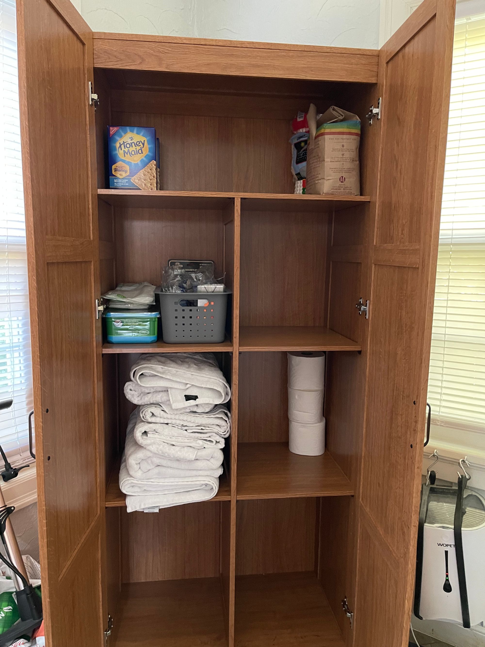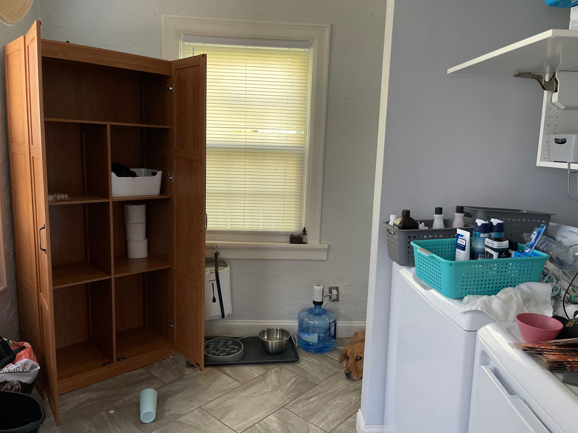 One major downfall of our kitchen is no pantry space. It's been annoying each time we get groceries rearranging and finding a place for everything. Black friday brought a very nice storage cabinent to go in our laundry room for extra groceries, and other odds + ends storage.