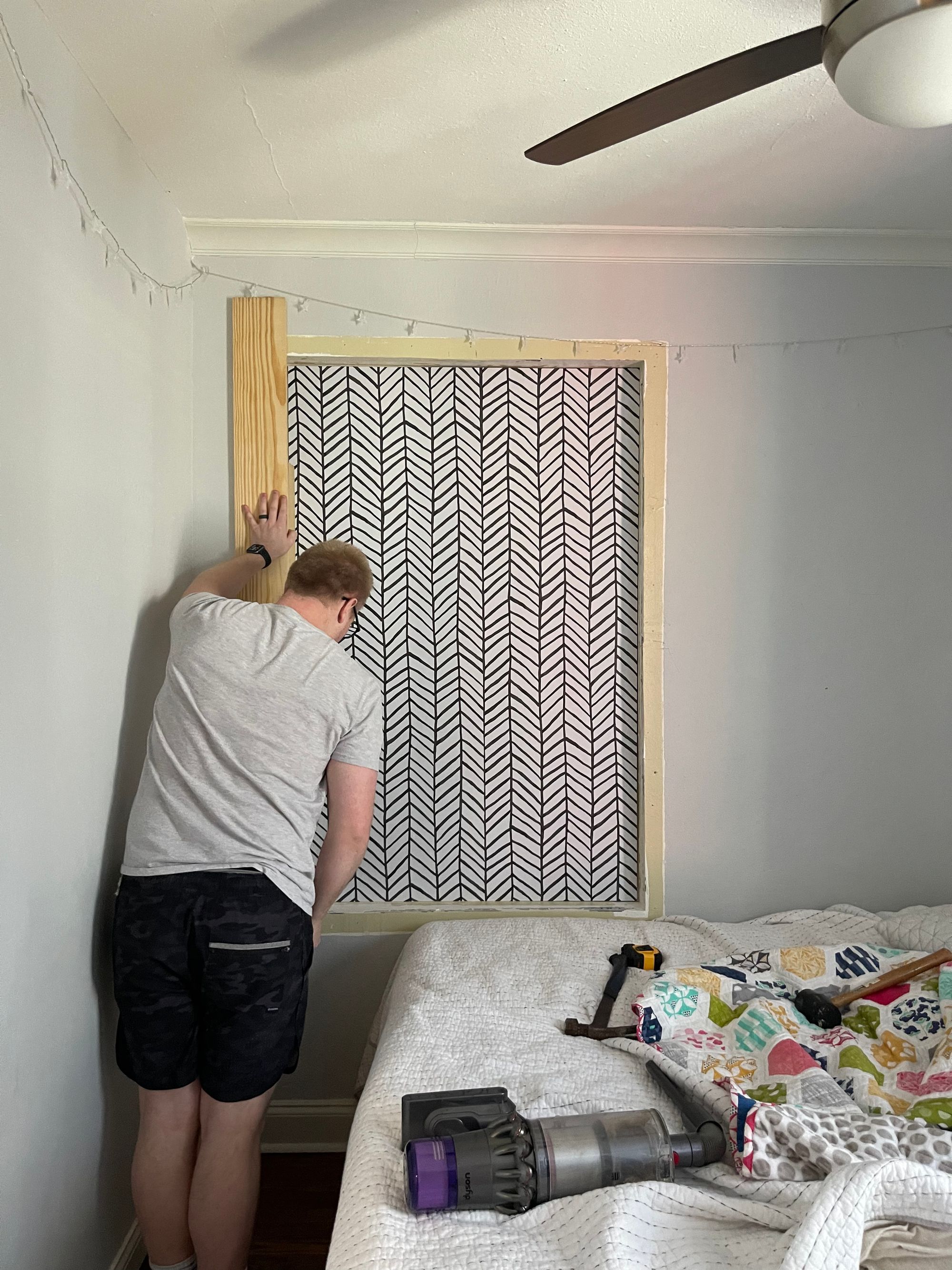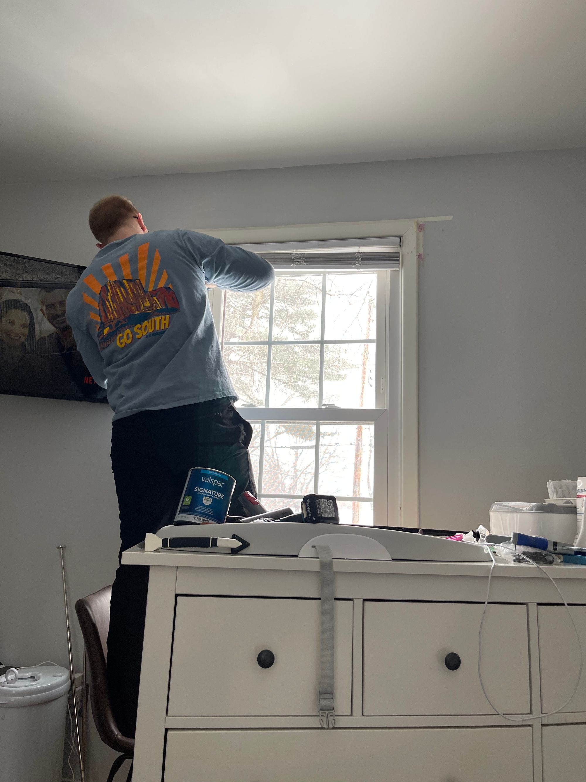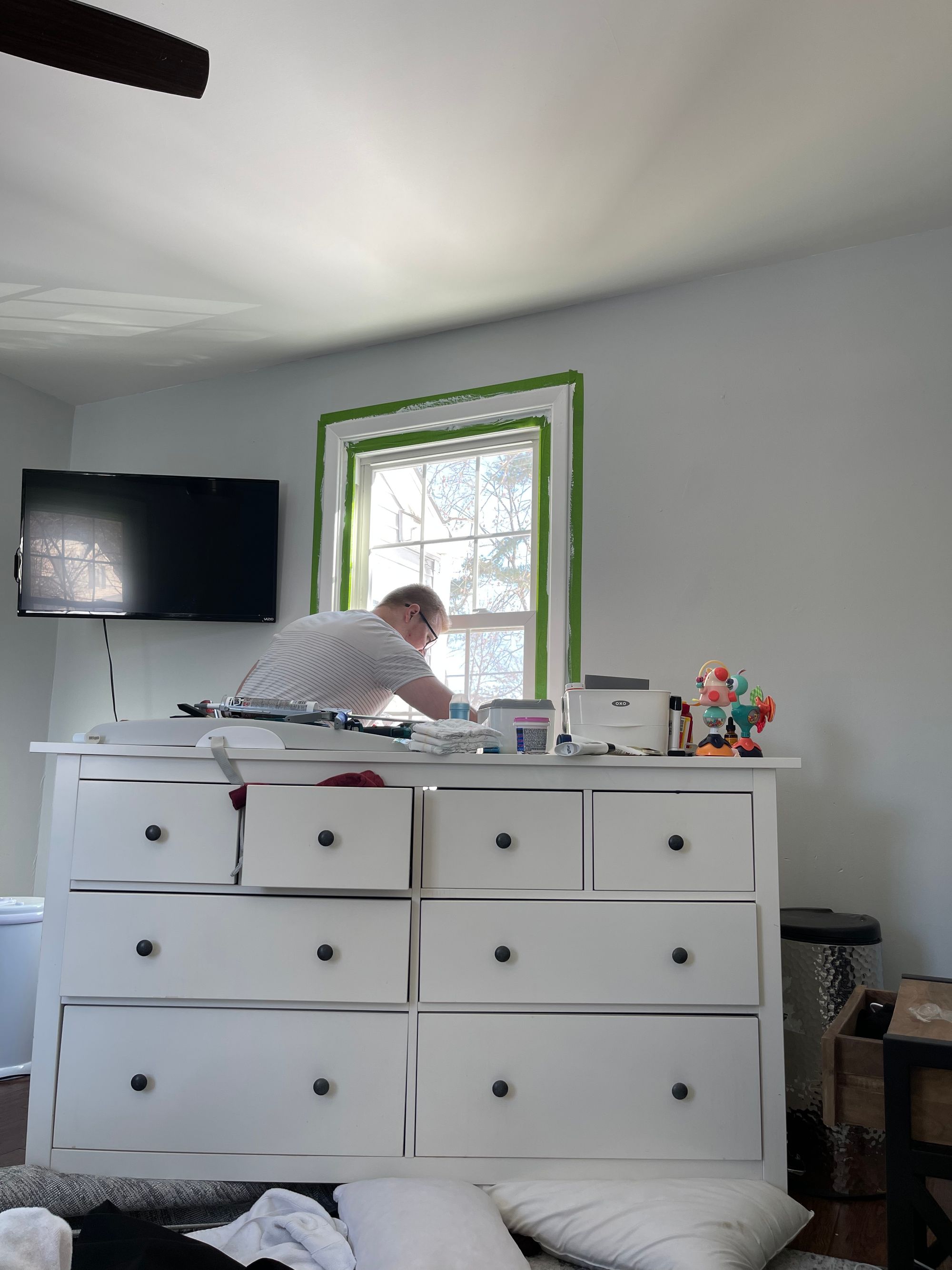 There have been these ridiculous shelves hanging over our windows in our bedroom. They make it impossible to hang a curtain rod so for the last two years we have been using a tension rod. It's worked fine... but nothing we want to keep dealing with for years to come. Logan quickly knocked them down, painted the frames and hung up some curtain rods. So much better!