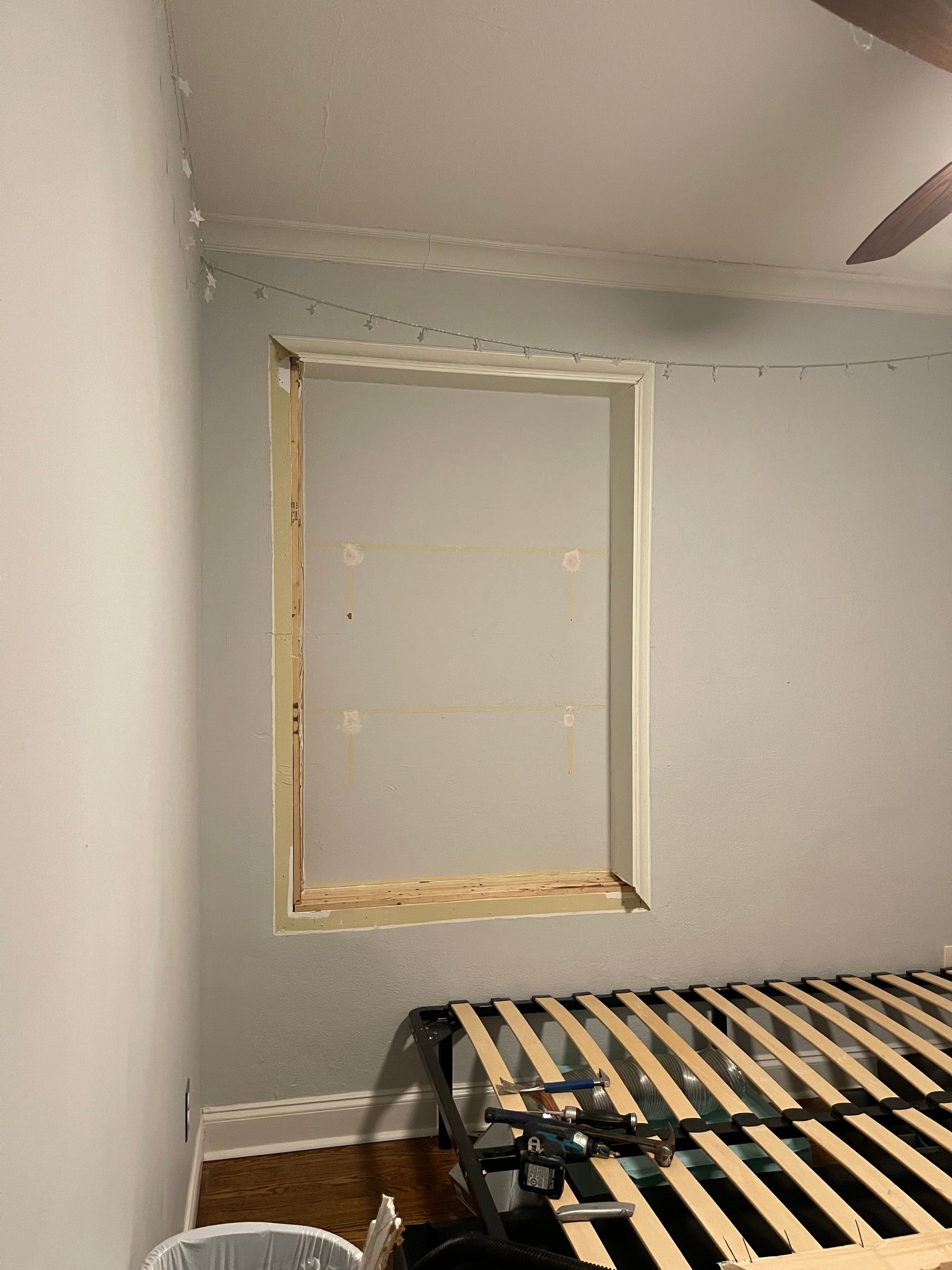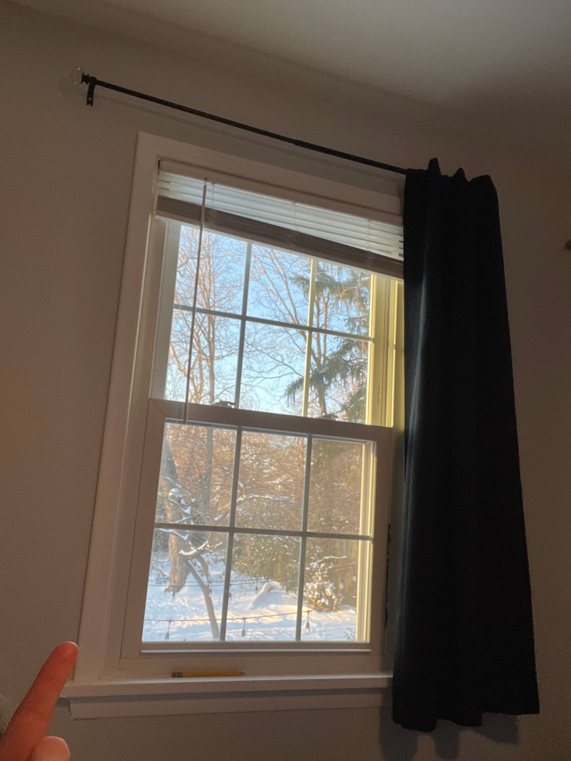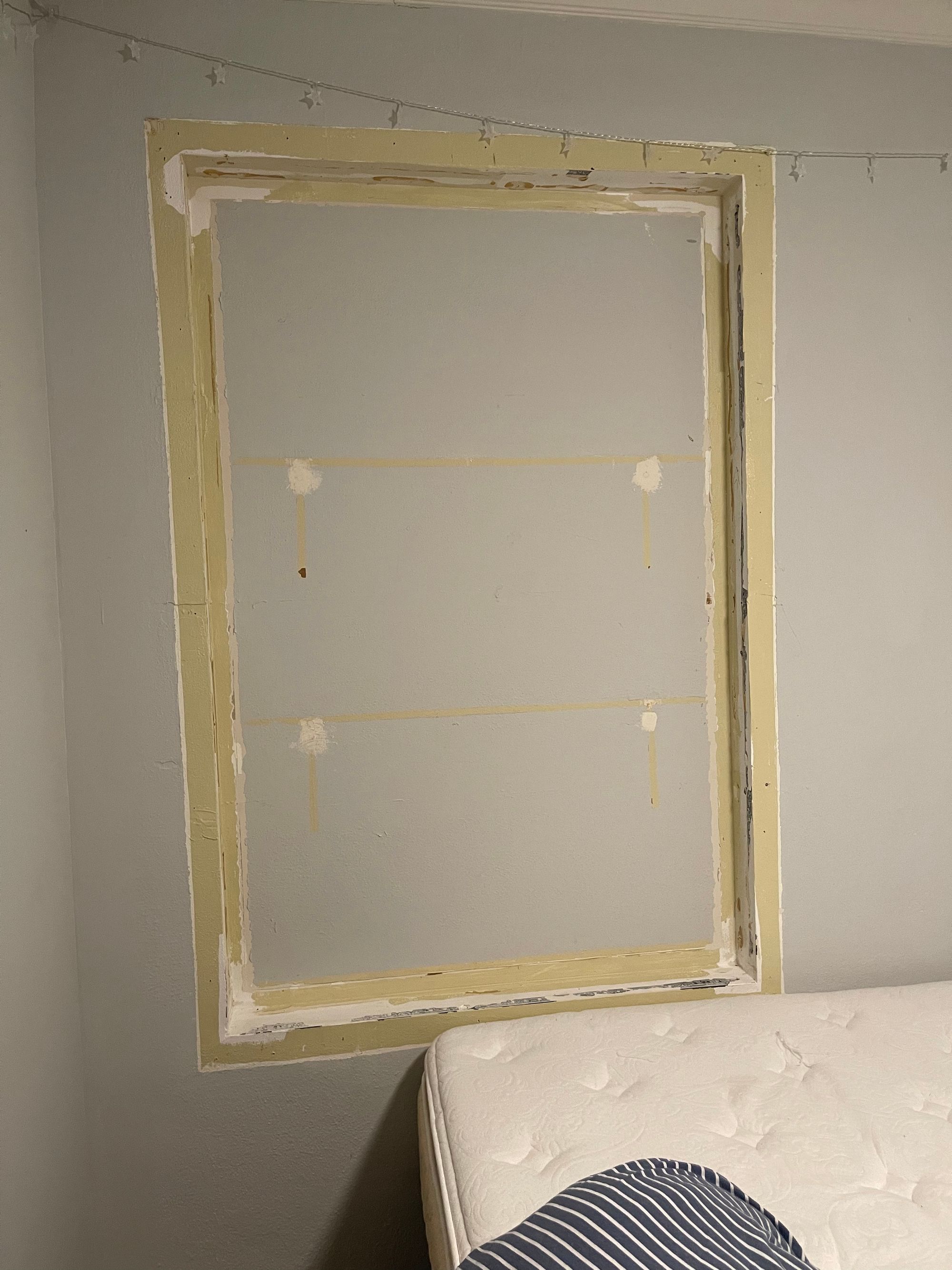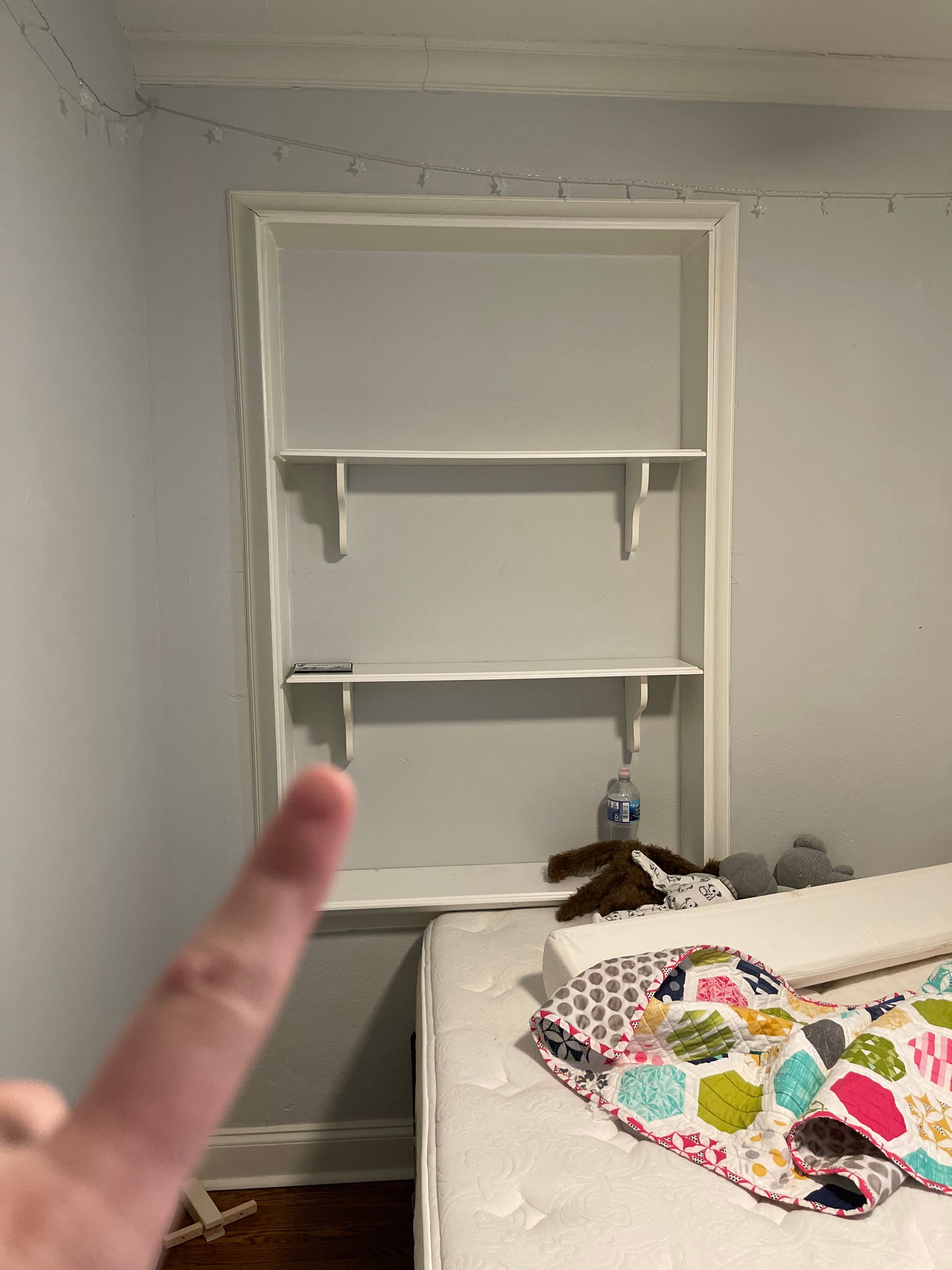 There have been these ridiculous shelves hanging over our windows in our bedroom. They make it impossible to hang a curtain rod so for the last two years we have been using a tension rod. It's worked fine... but nothing we want to keep dealing with for years to come. Logan quickly knocked them down, painted the frames and hung up some curtain rods. So much better!
