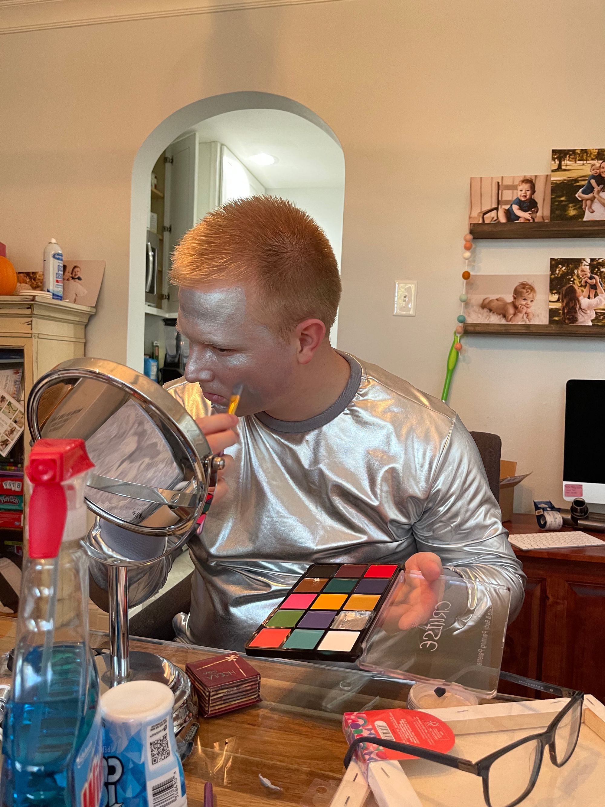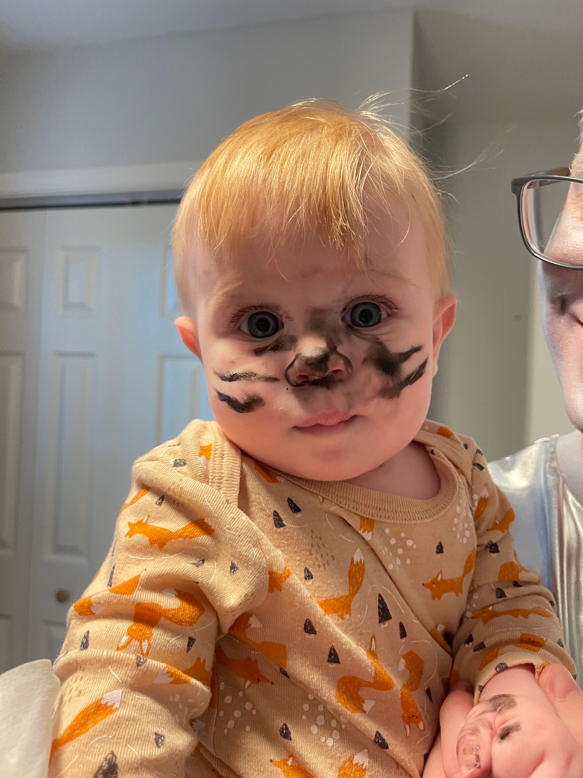 We got all ready, Logan painted his face with the grey metallic, I added on some scarecrow lines and we attemped to give Benny some whiskers.... he rubbed his face right as we got it on!