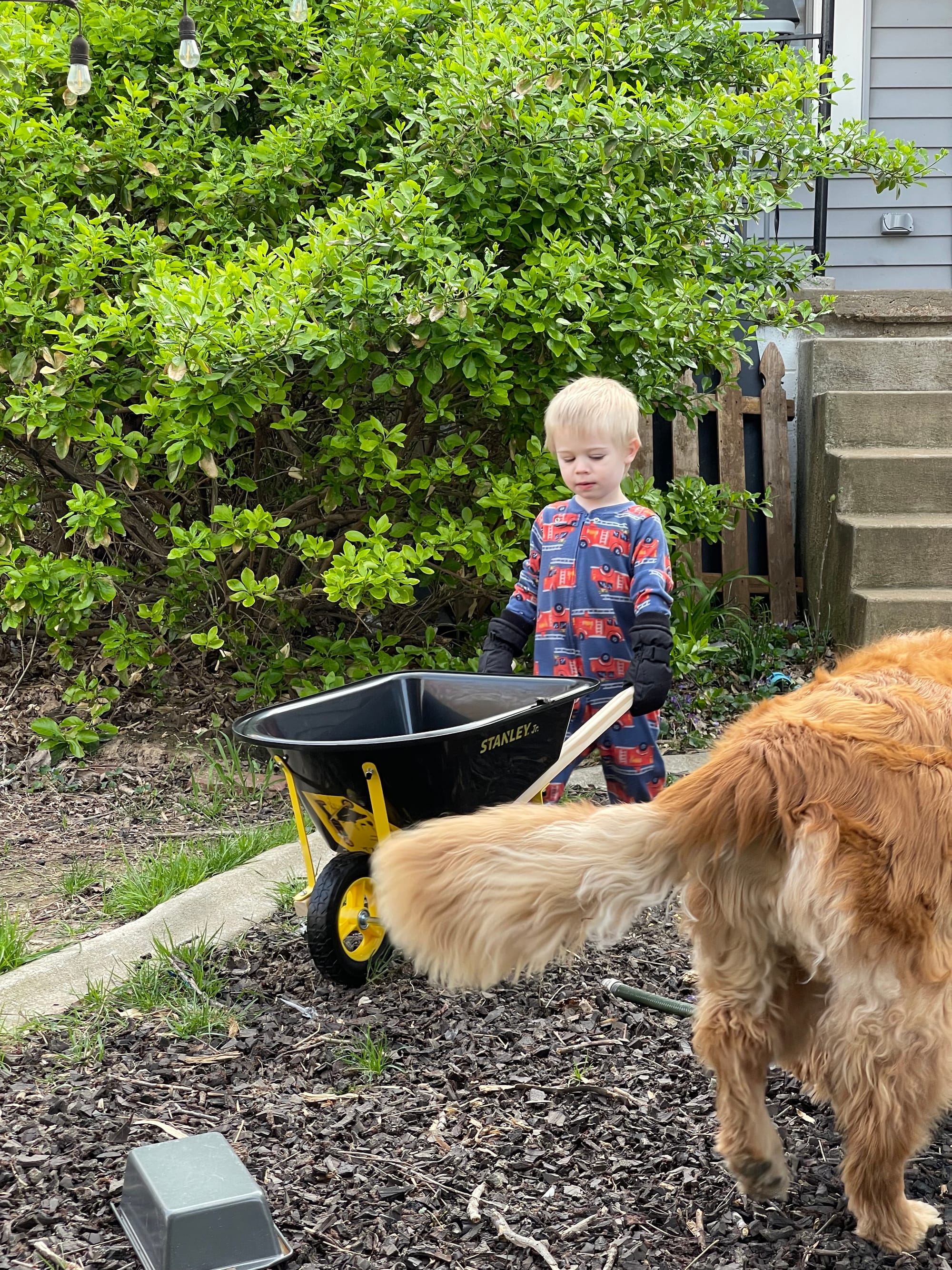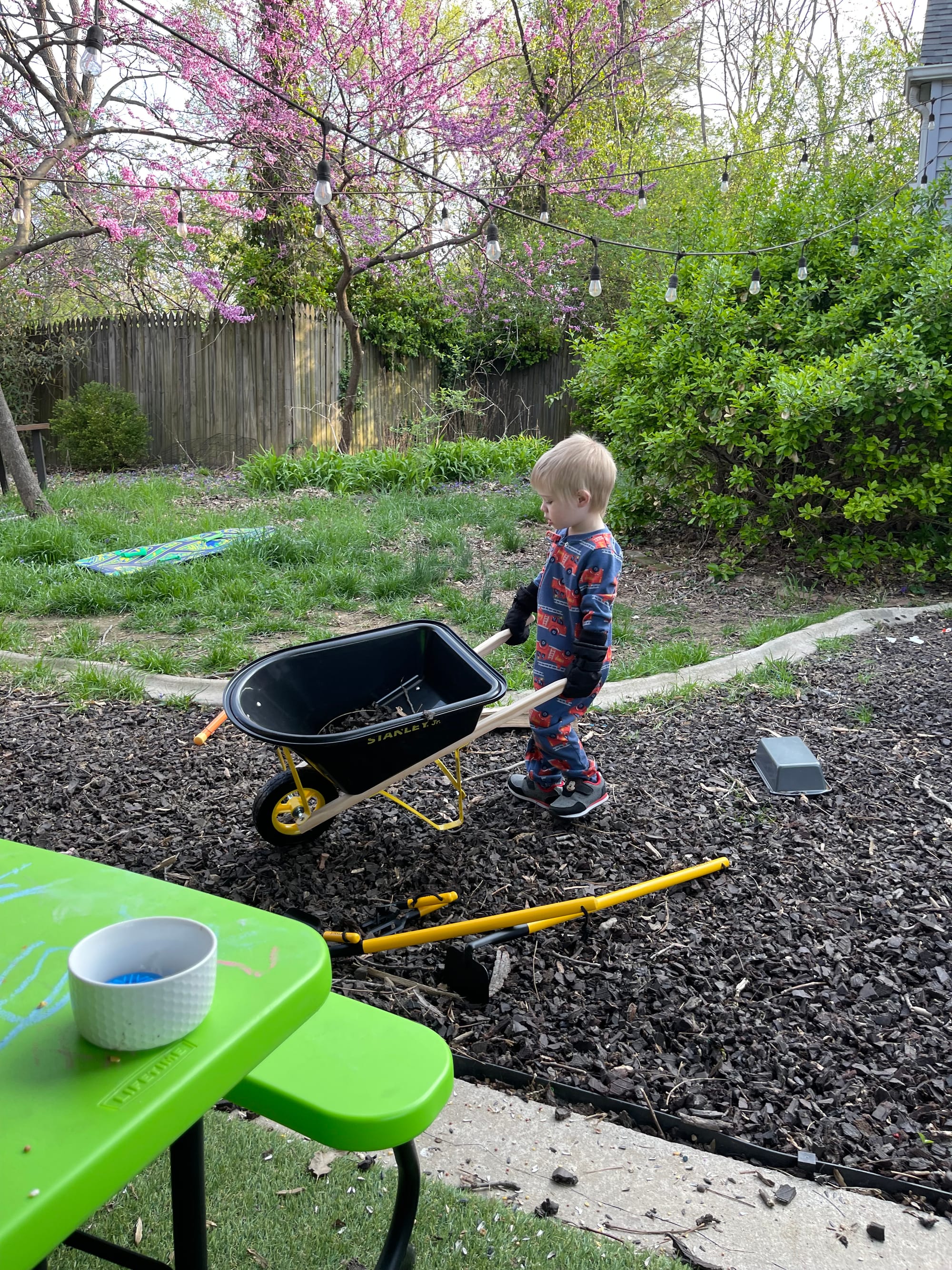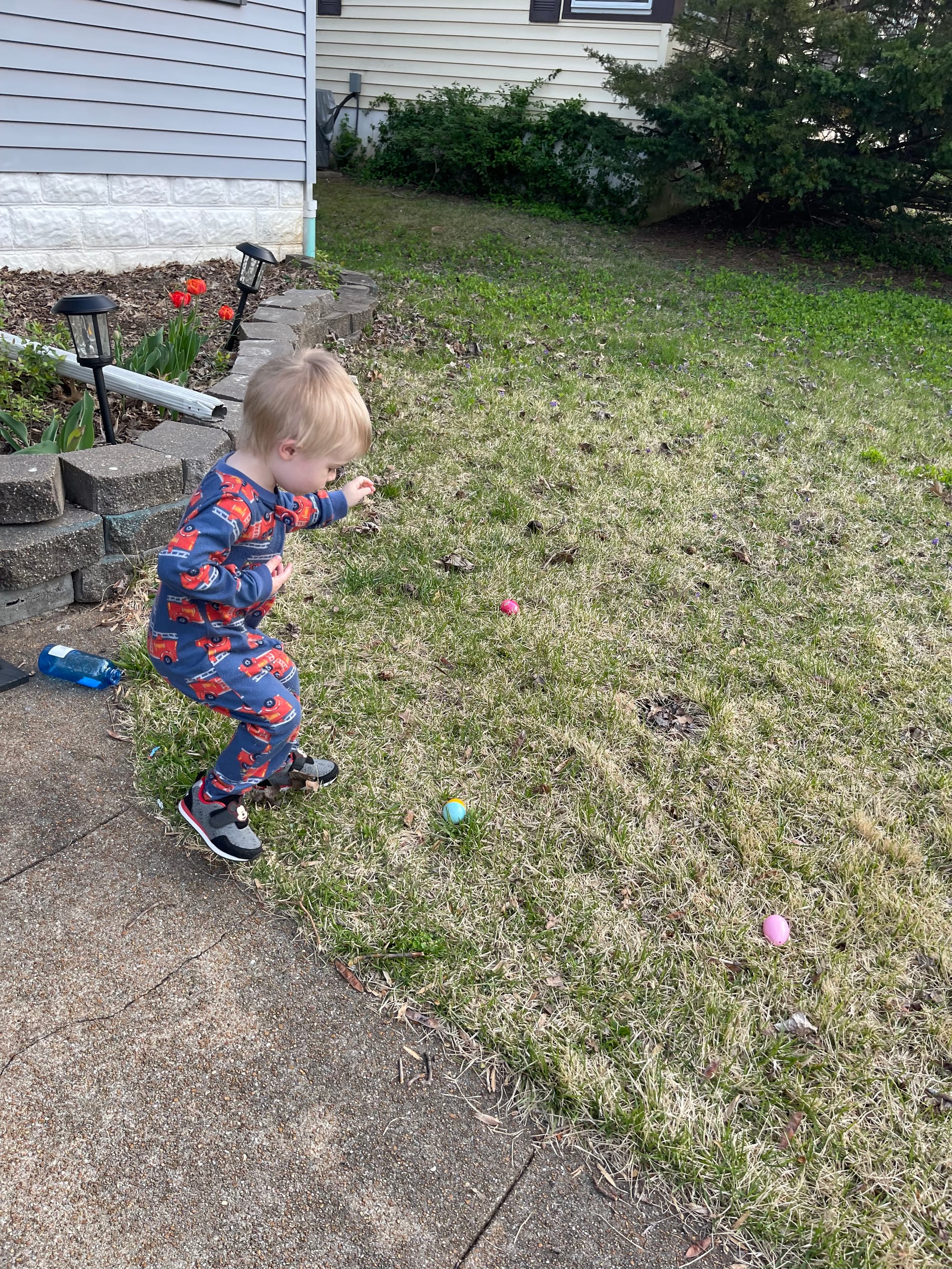 Easter egg hunt Easter morning! He got the cutest little wheelbarrow and tools!
