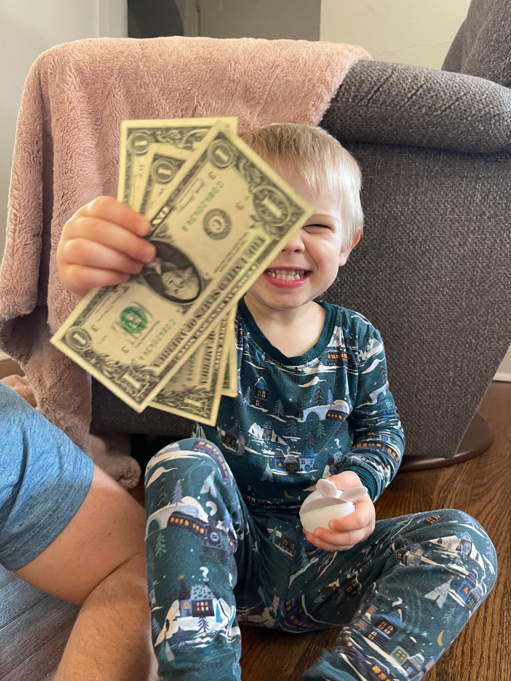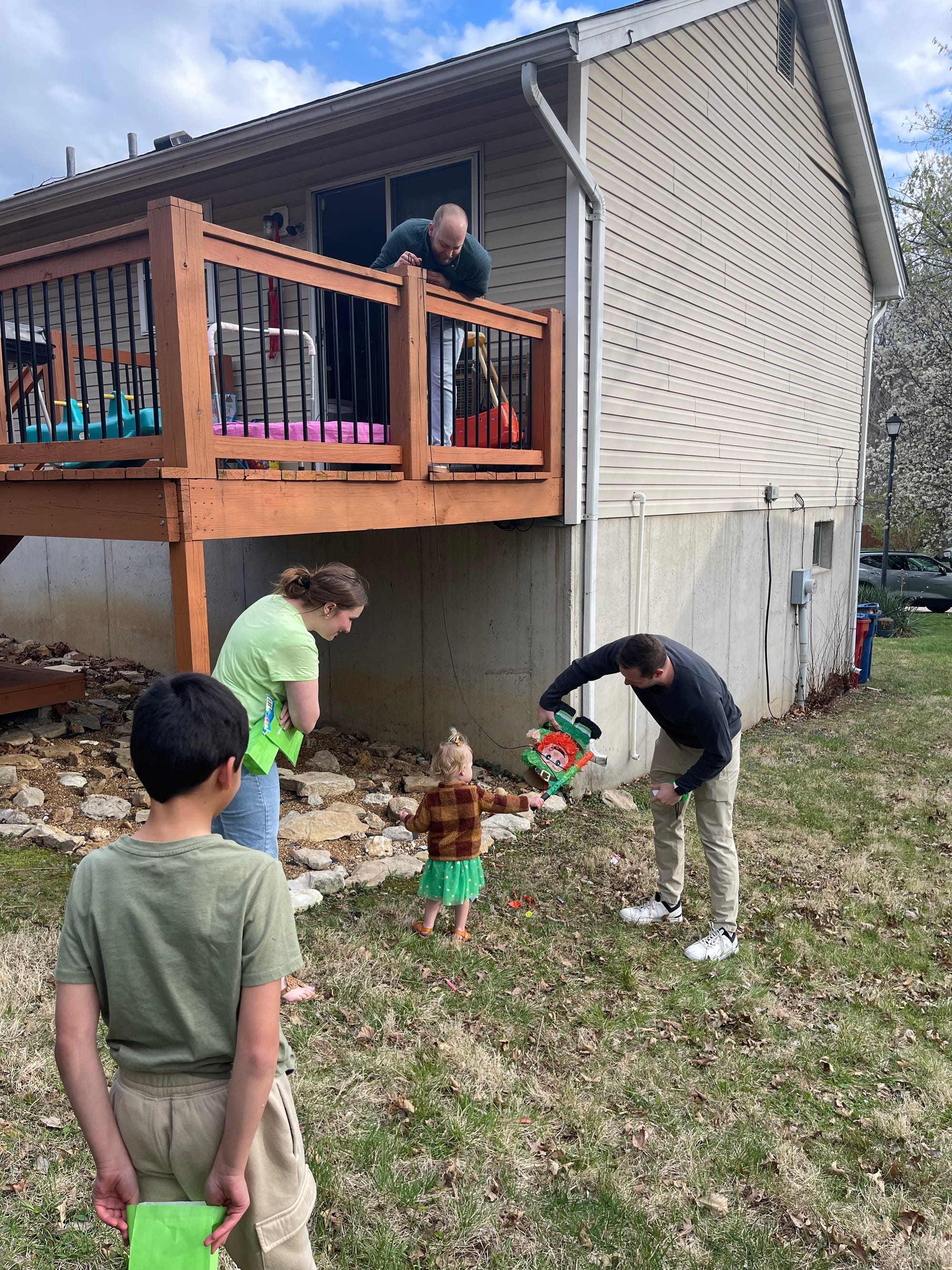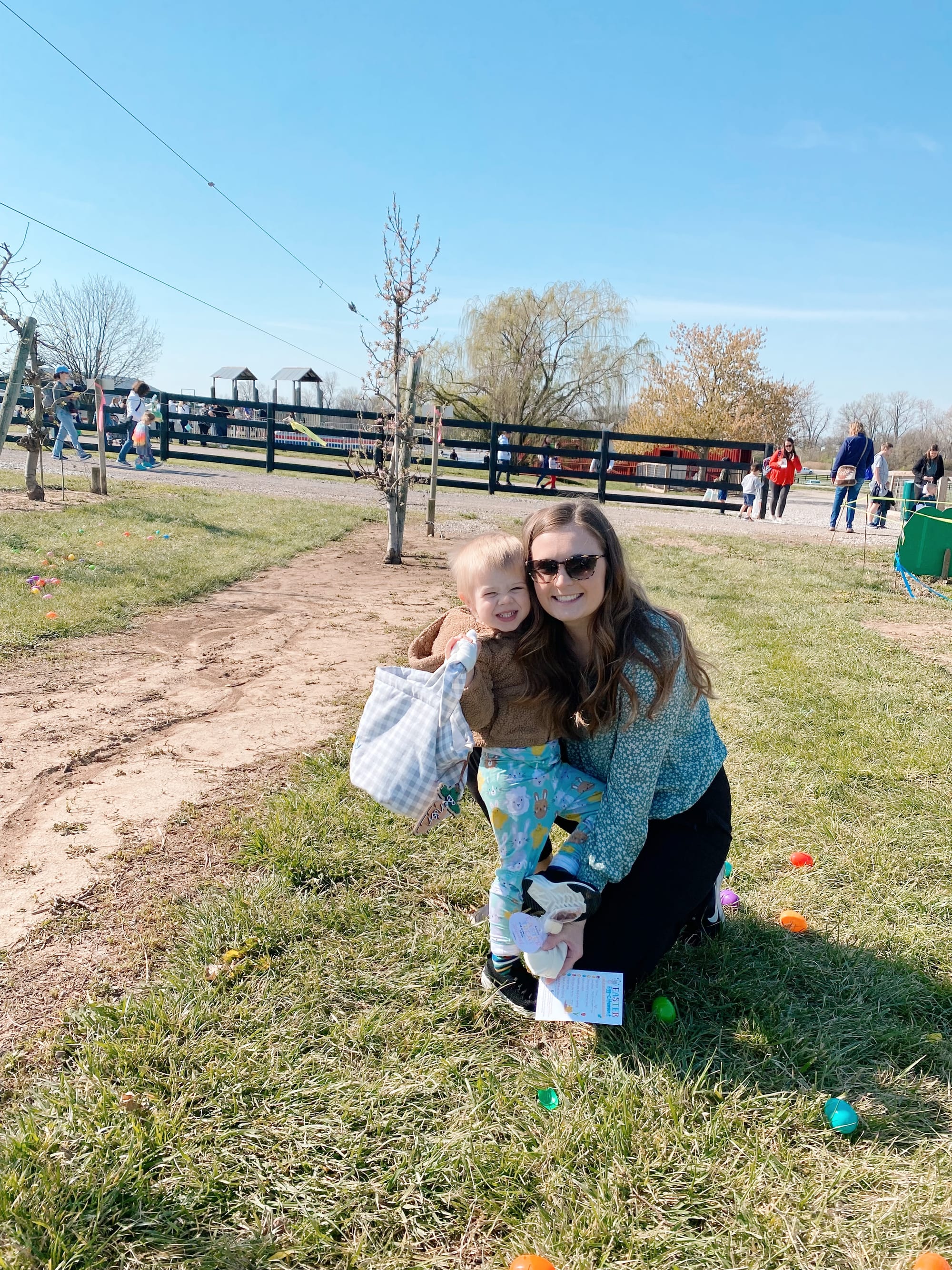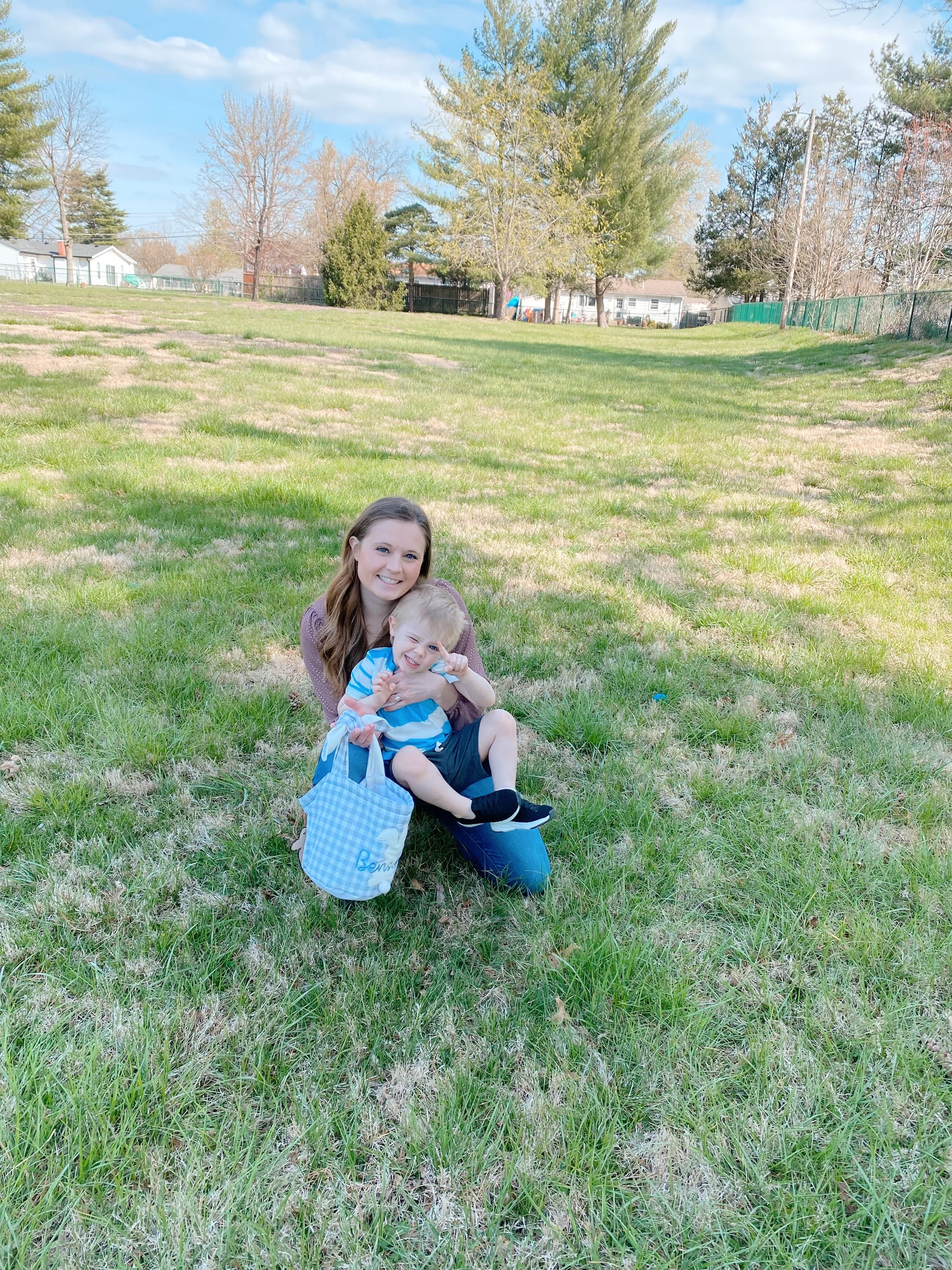 Easter egg hunt Easter morning! He got the cutest little wheelbarrow and tools!