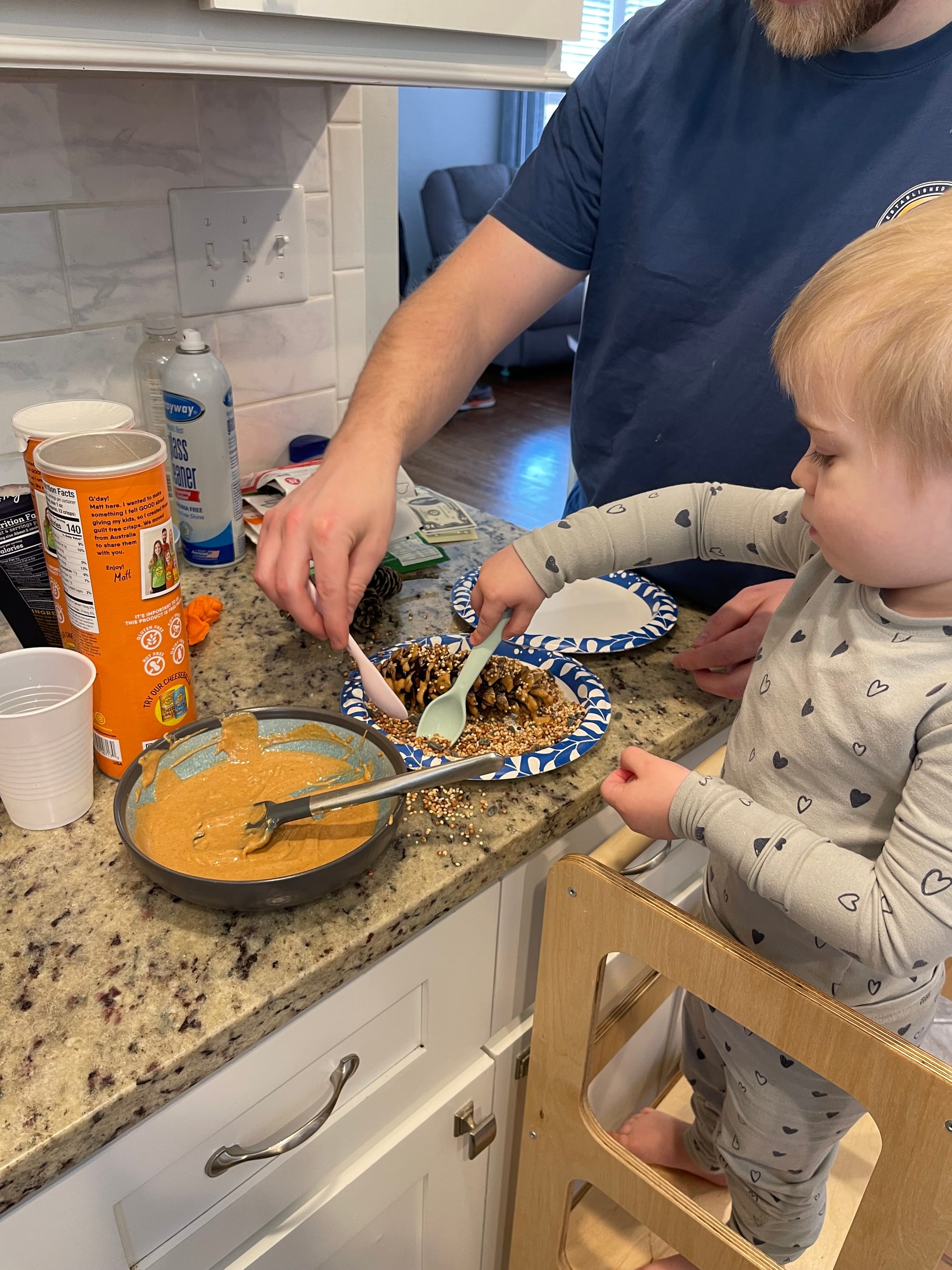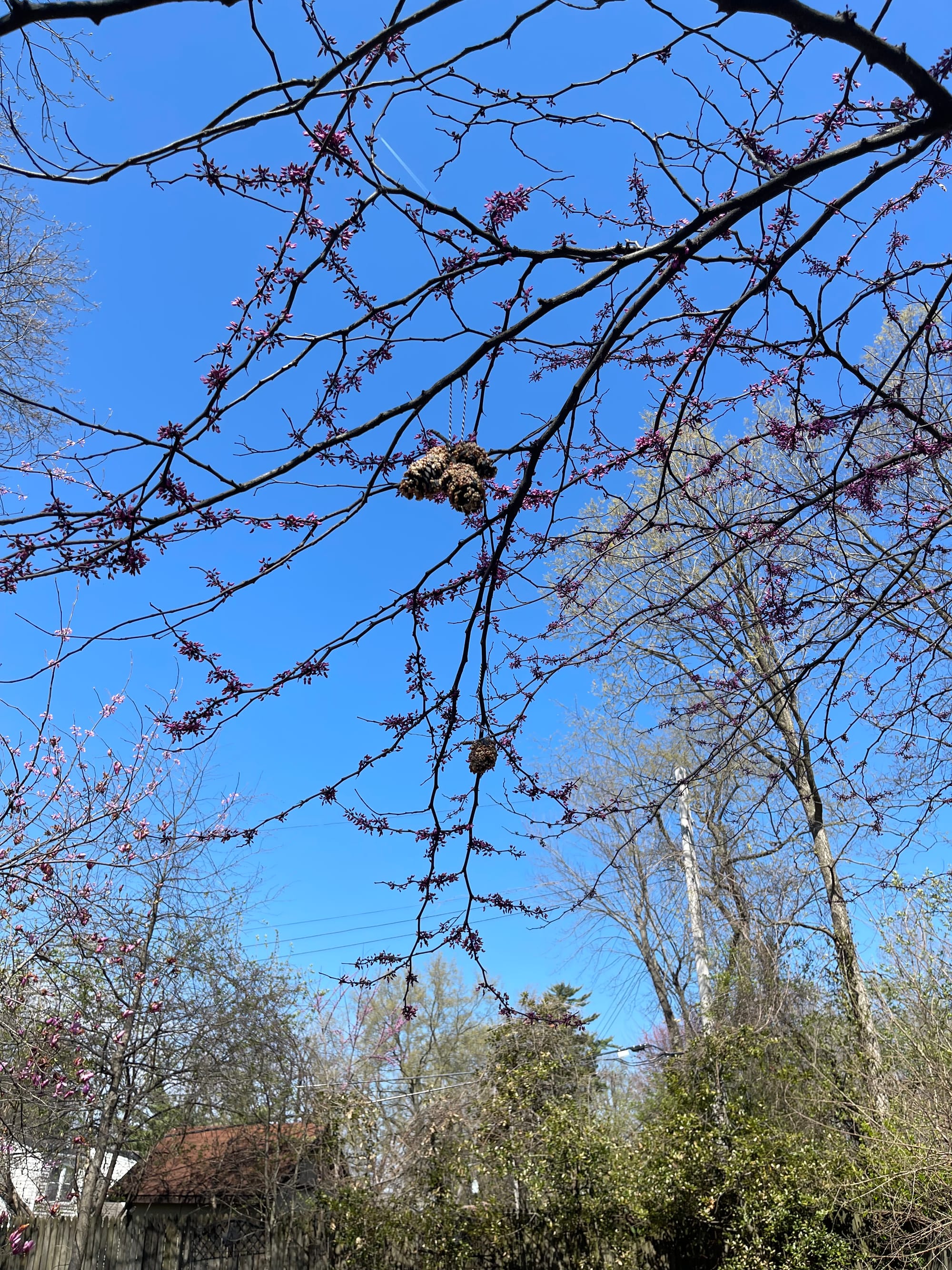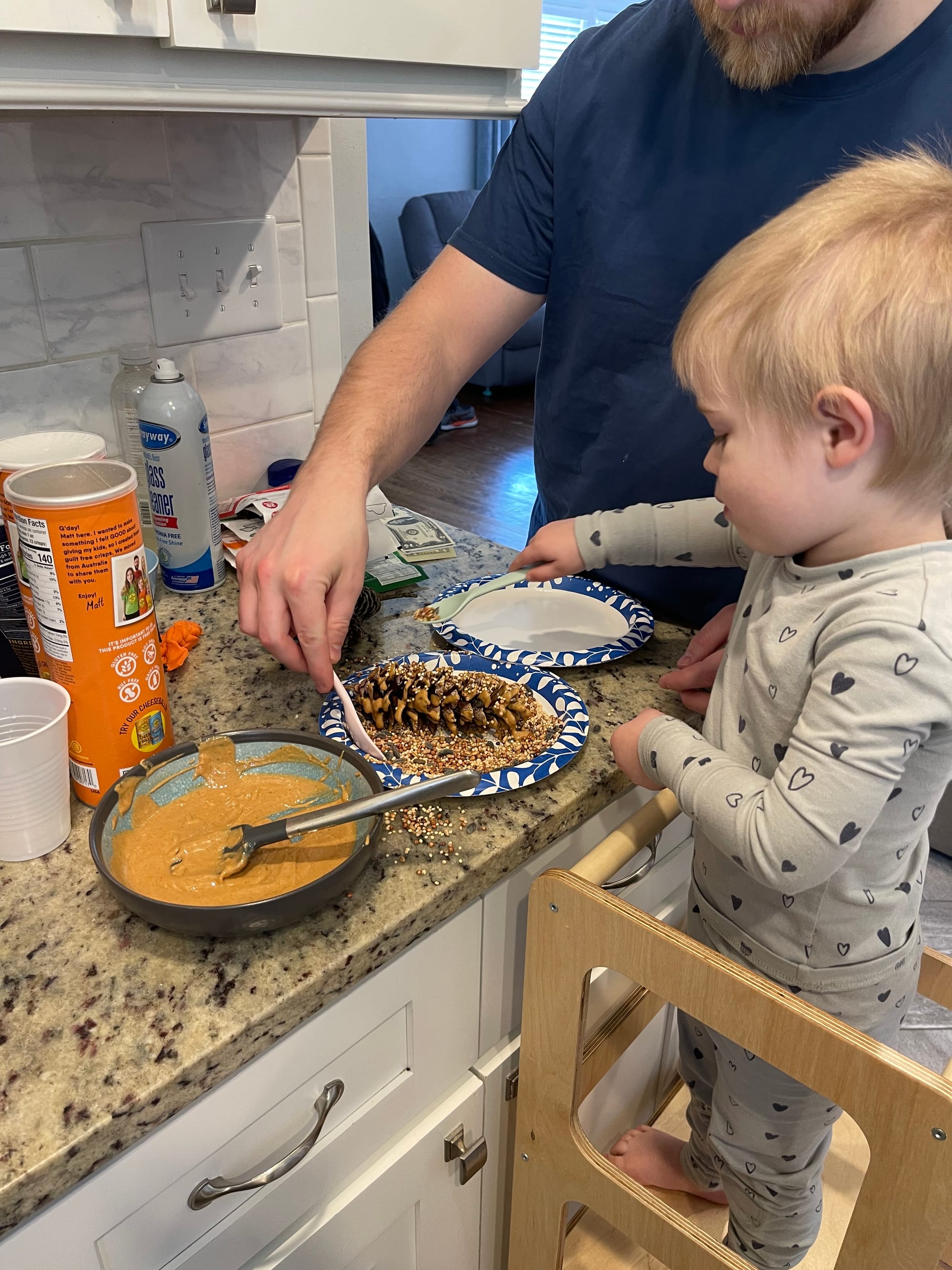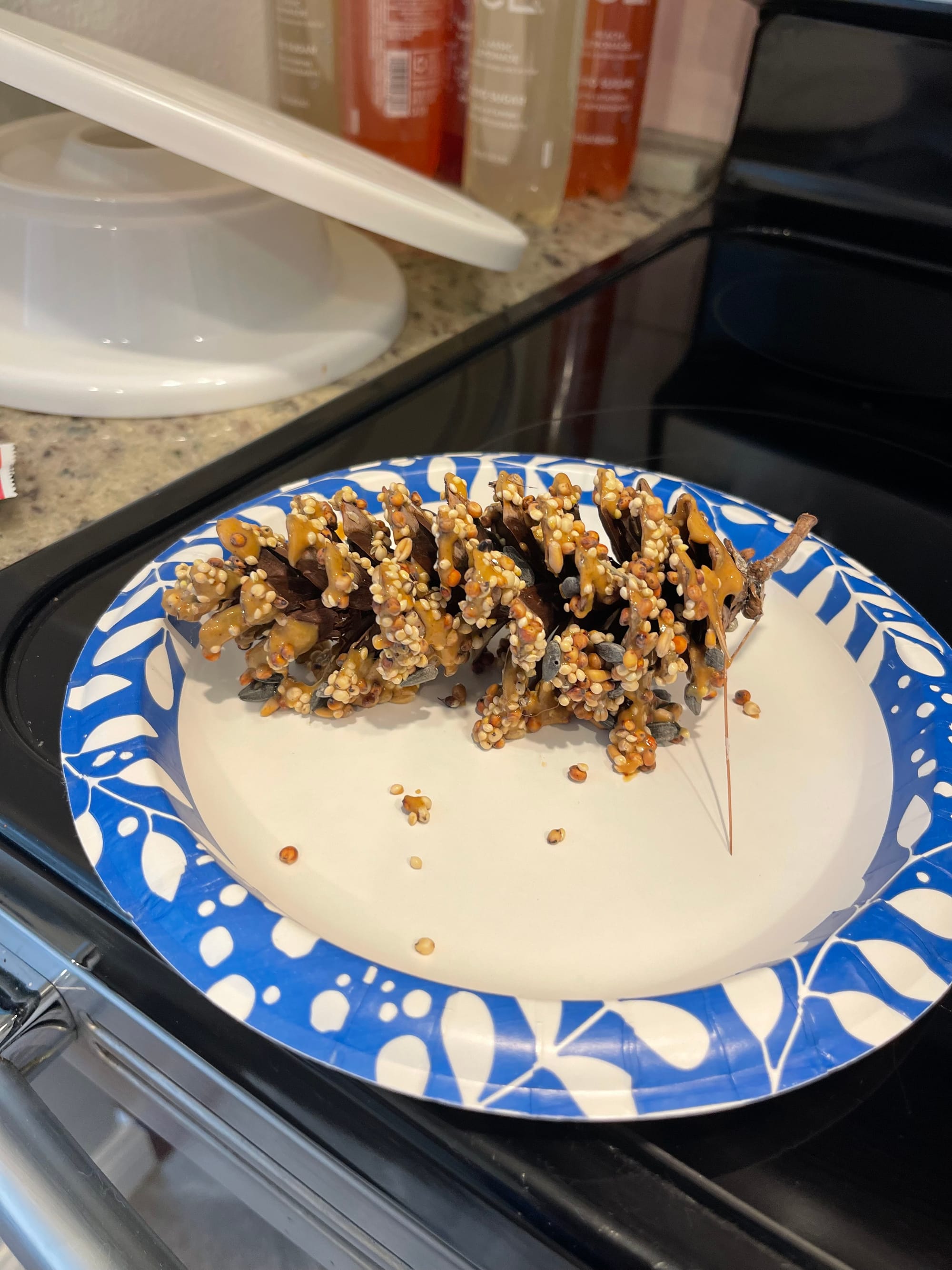 We made some peanut butter bird seed pinecones! The squirrels quickly snatched them.