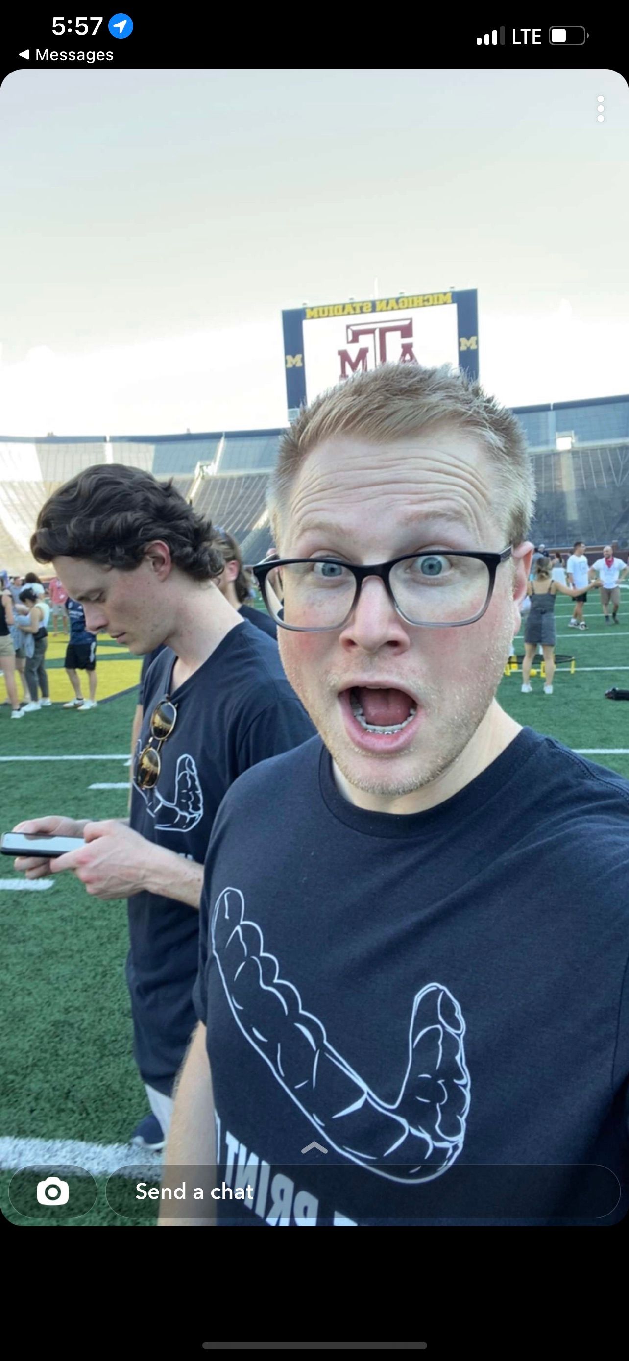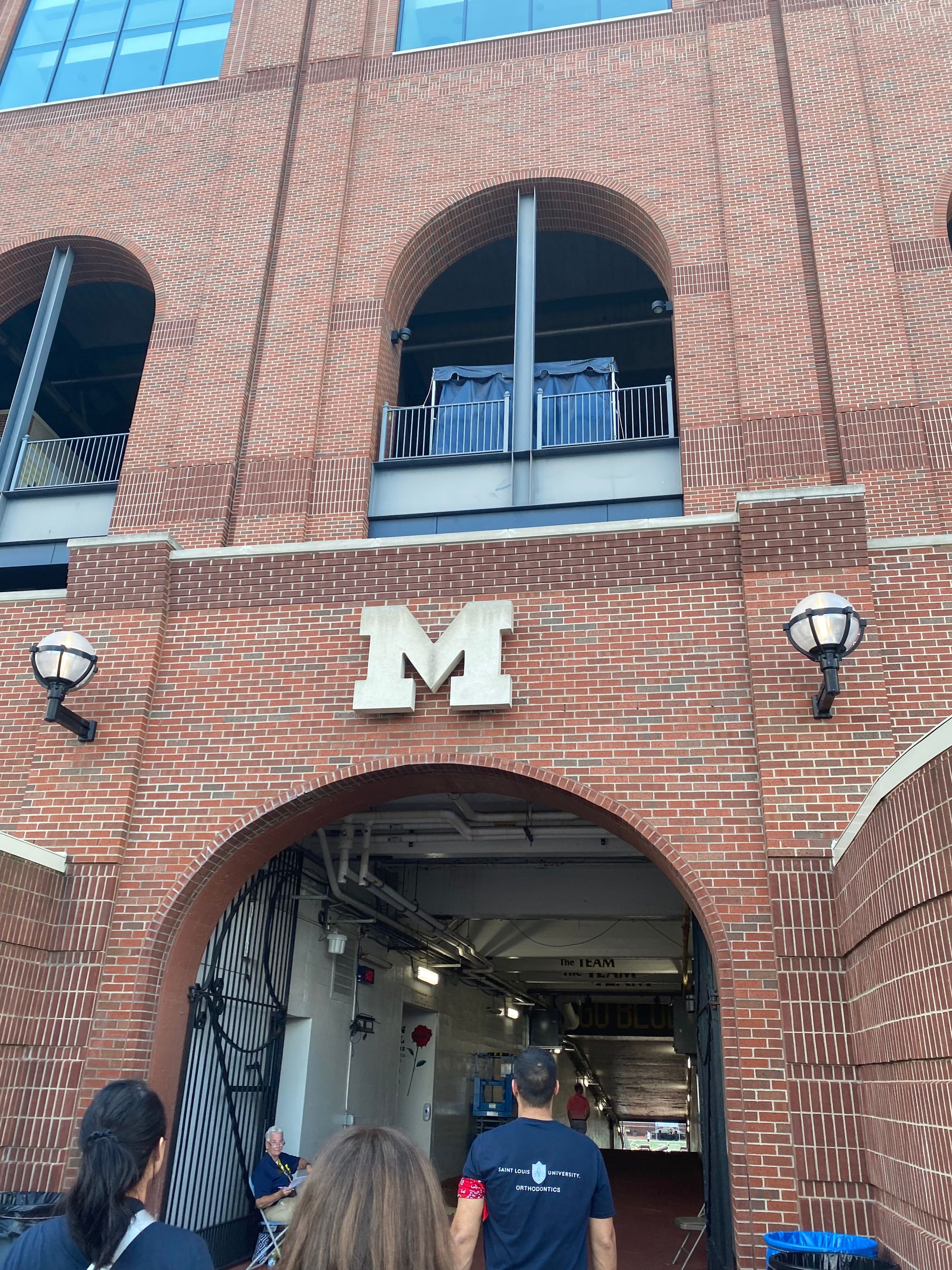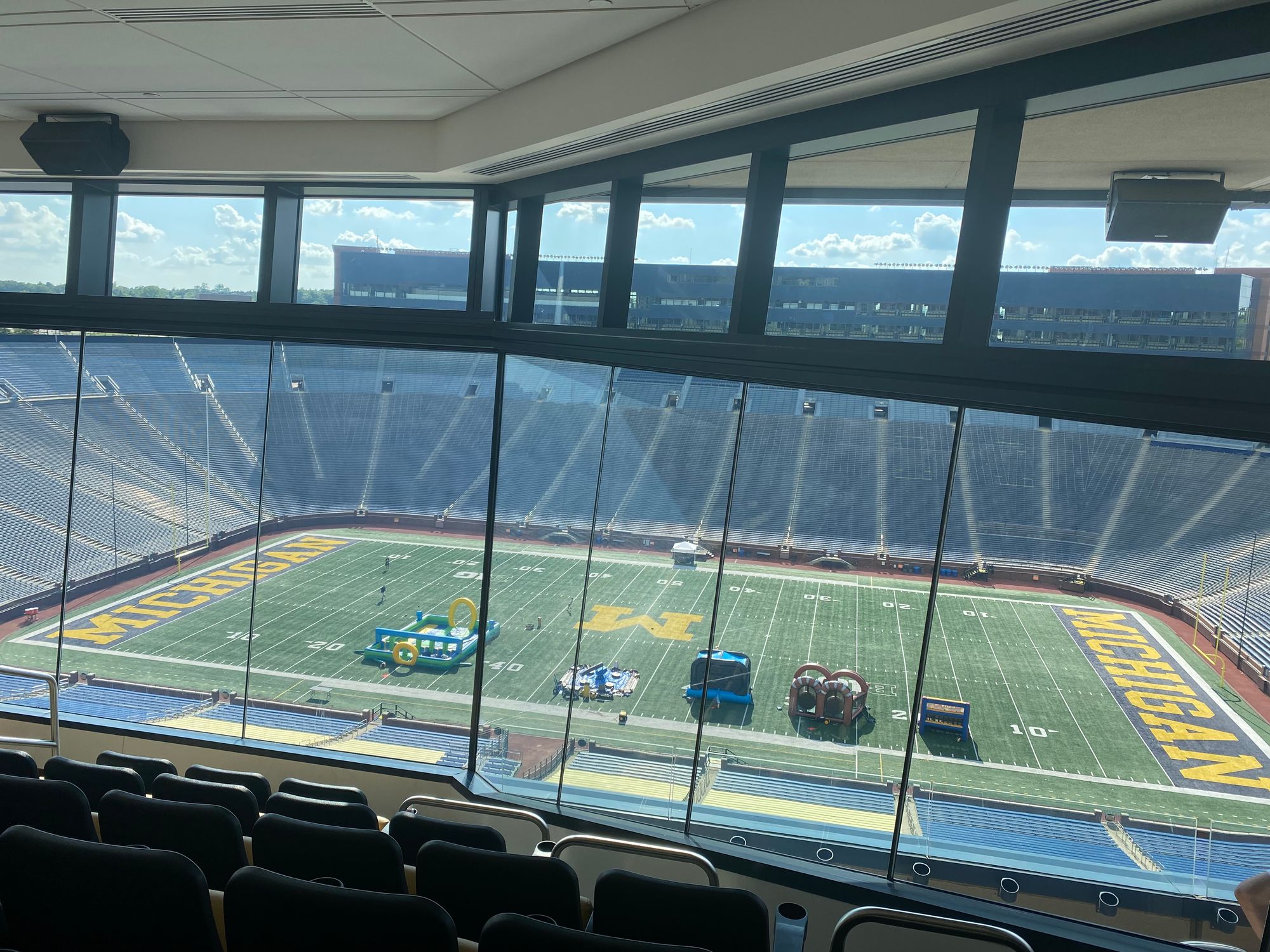 Logan attends some lectors, visits some vendors, relaxes, and gets ready for a fun dinner at the Michigan stadium. They placed games down on the field and tried to kick some field goals. Tries an old fashion... paint thinner!