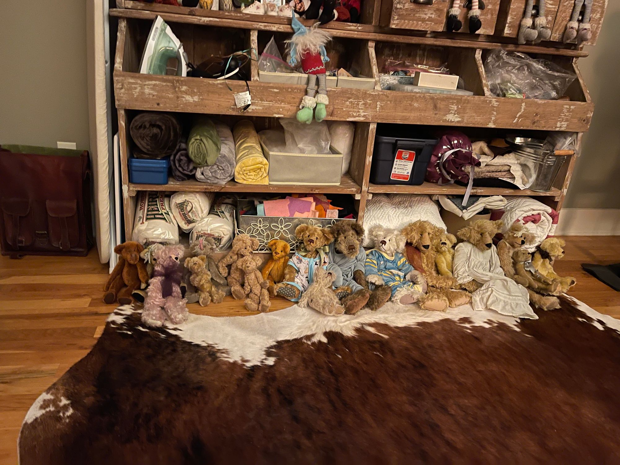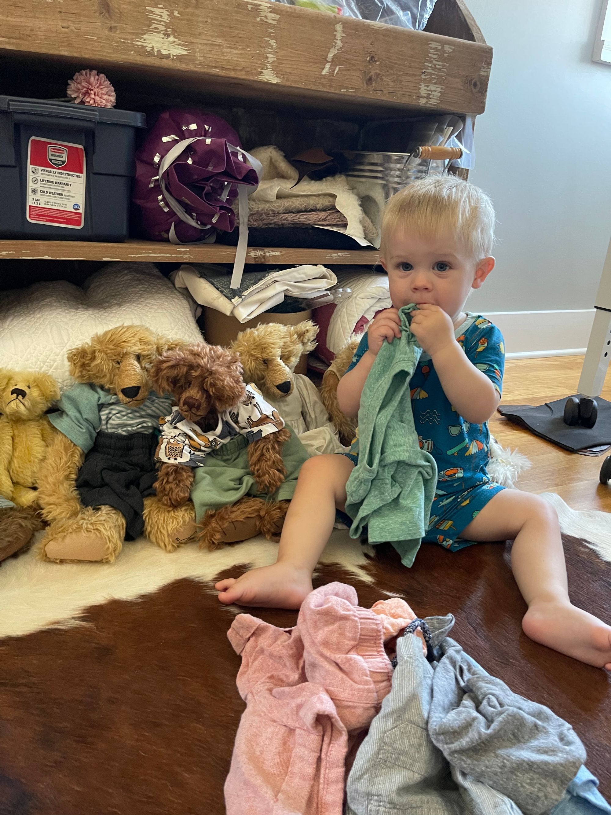 We have been dressing up all of the bears in Benson's clothes... he is loving it! Trying on Grandpa's cowboy hat!
