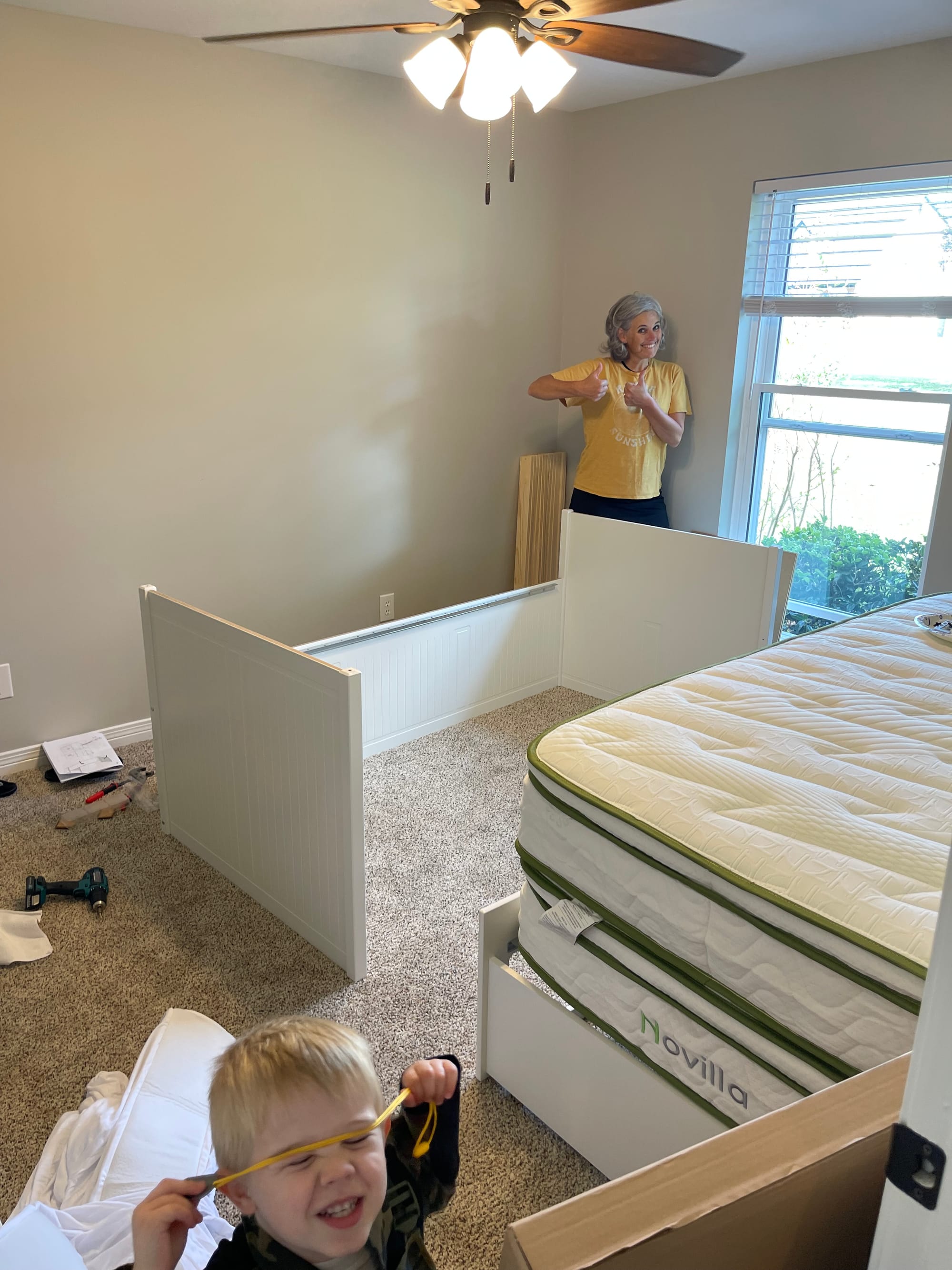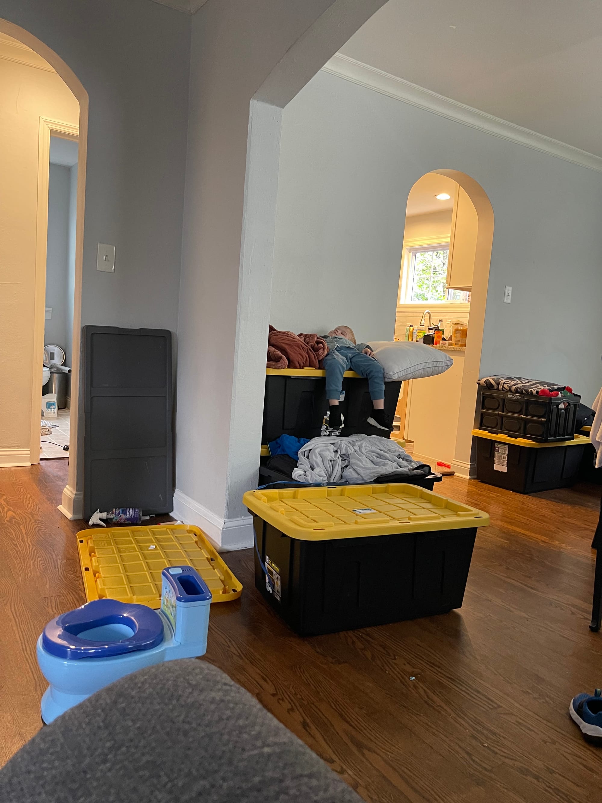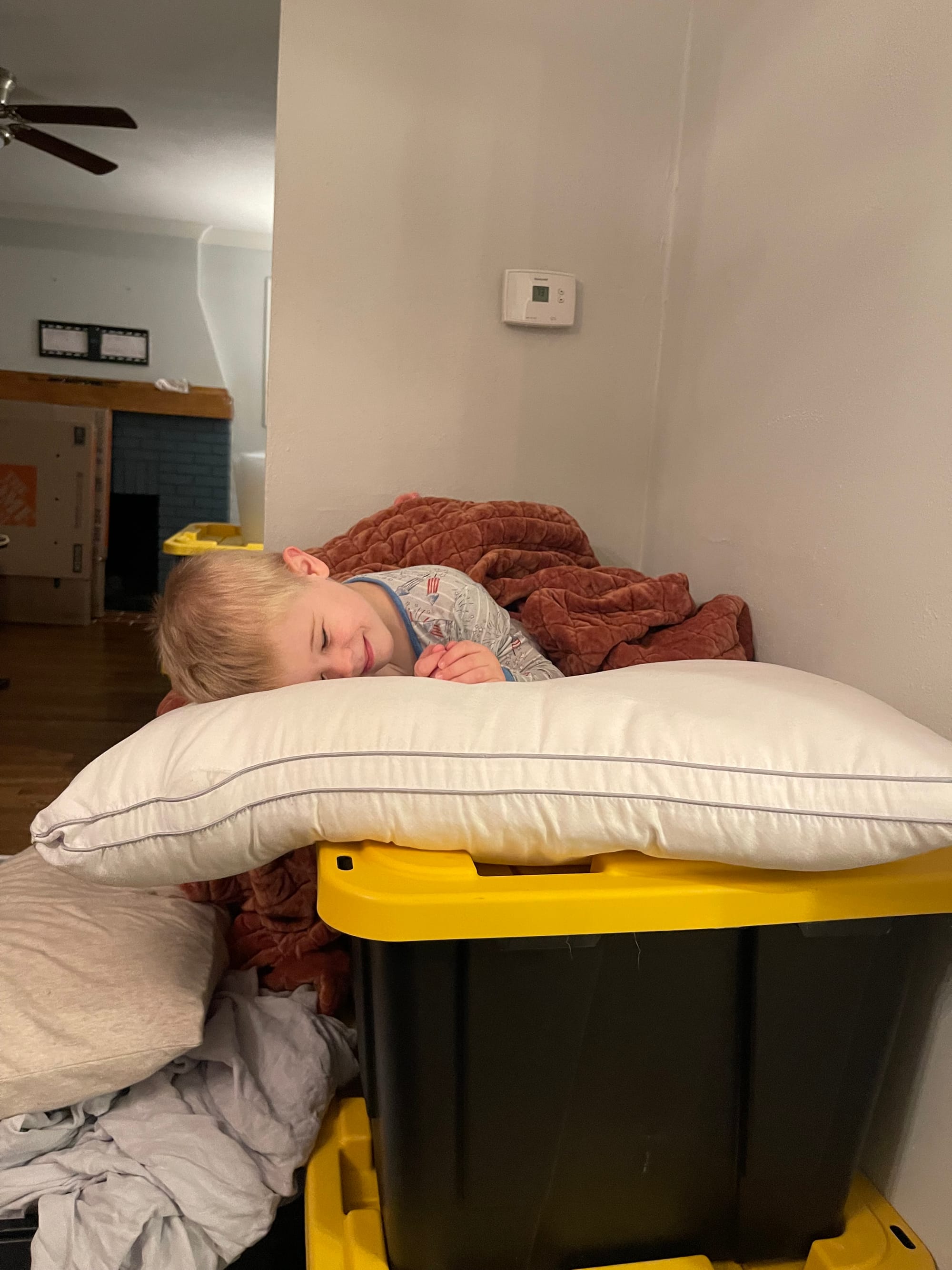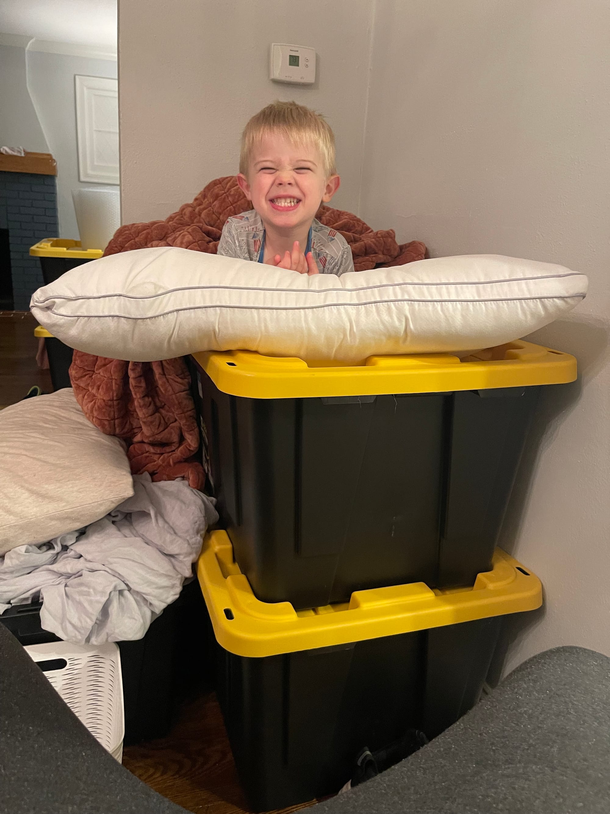 Ben has turned out pile of totes into a bunk bed. He thinks we should all sleep out here.