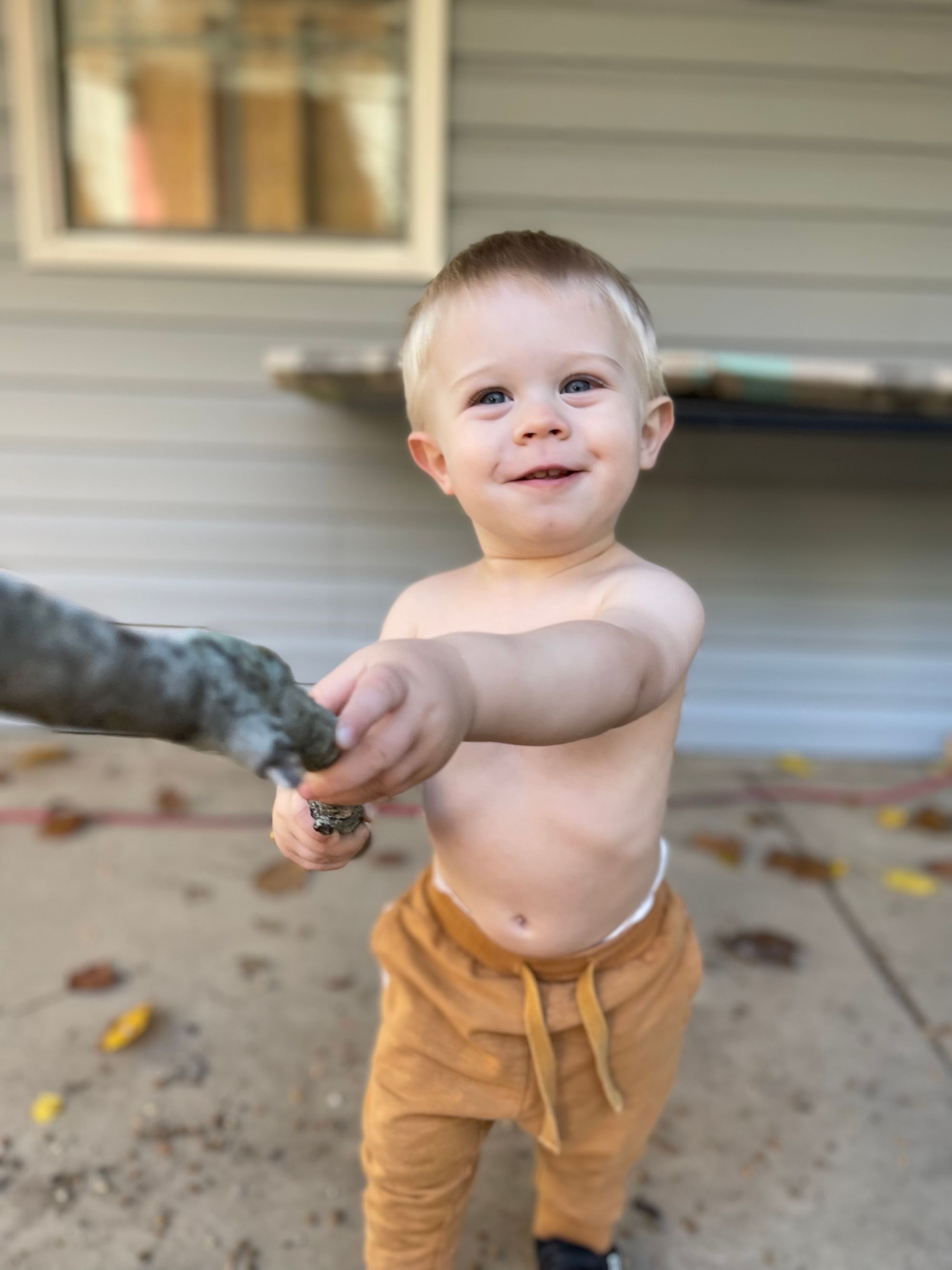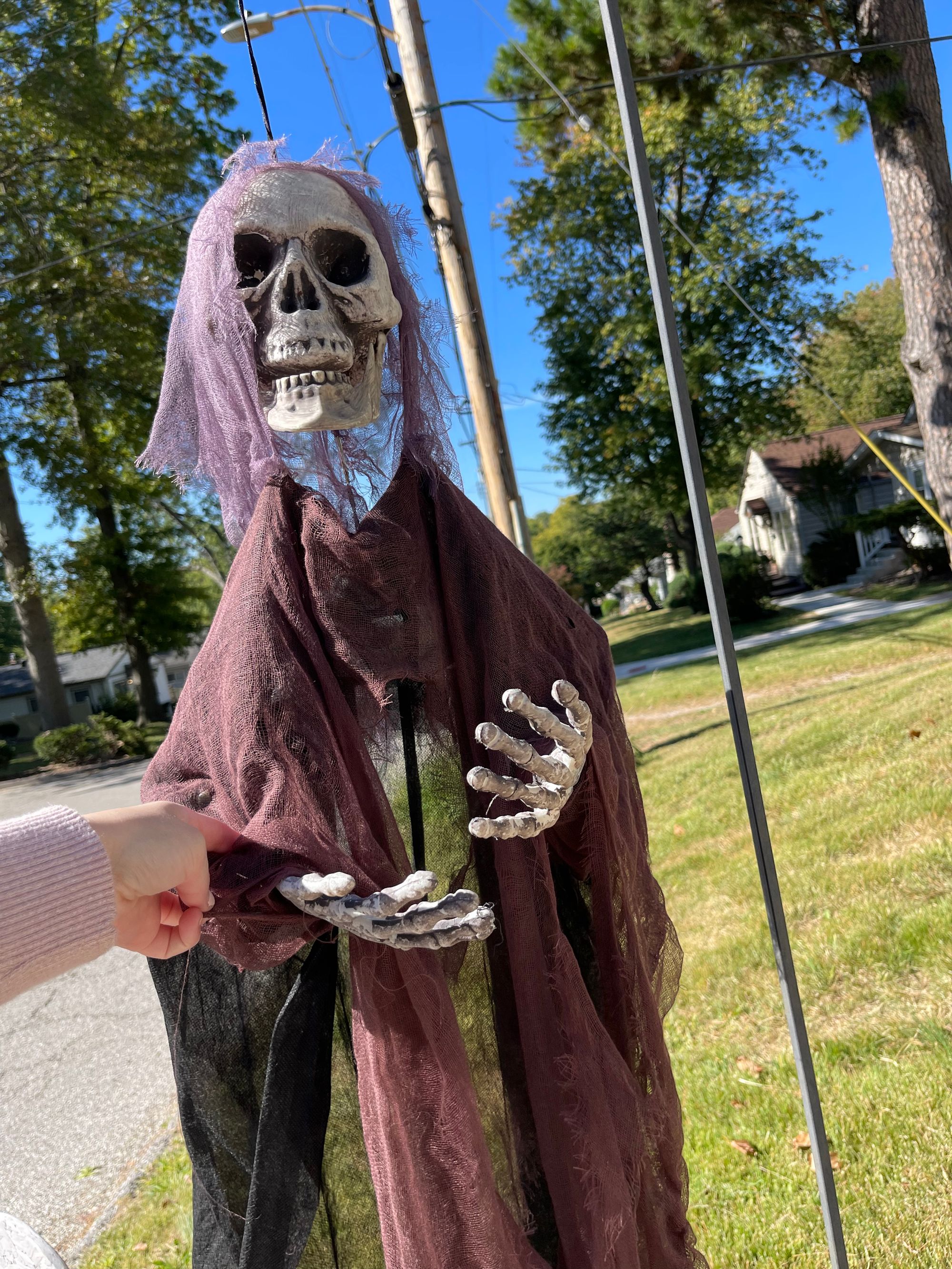Our neighbors put up this skeleton... Benson is not afraid at all and wants to go give it "knuckles" multiple times a day.