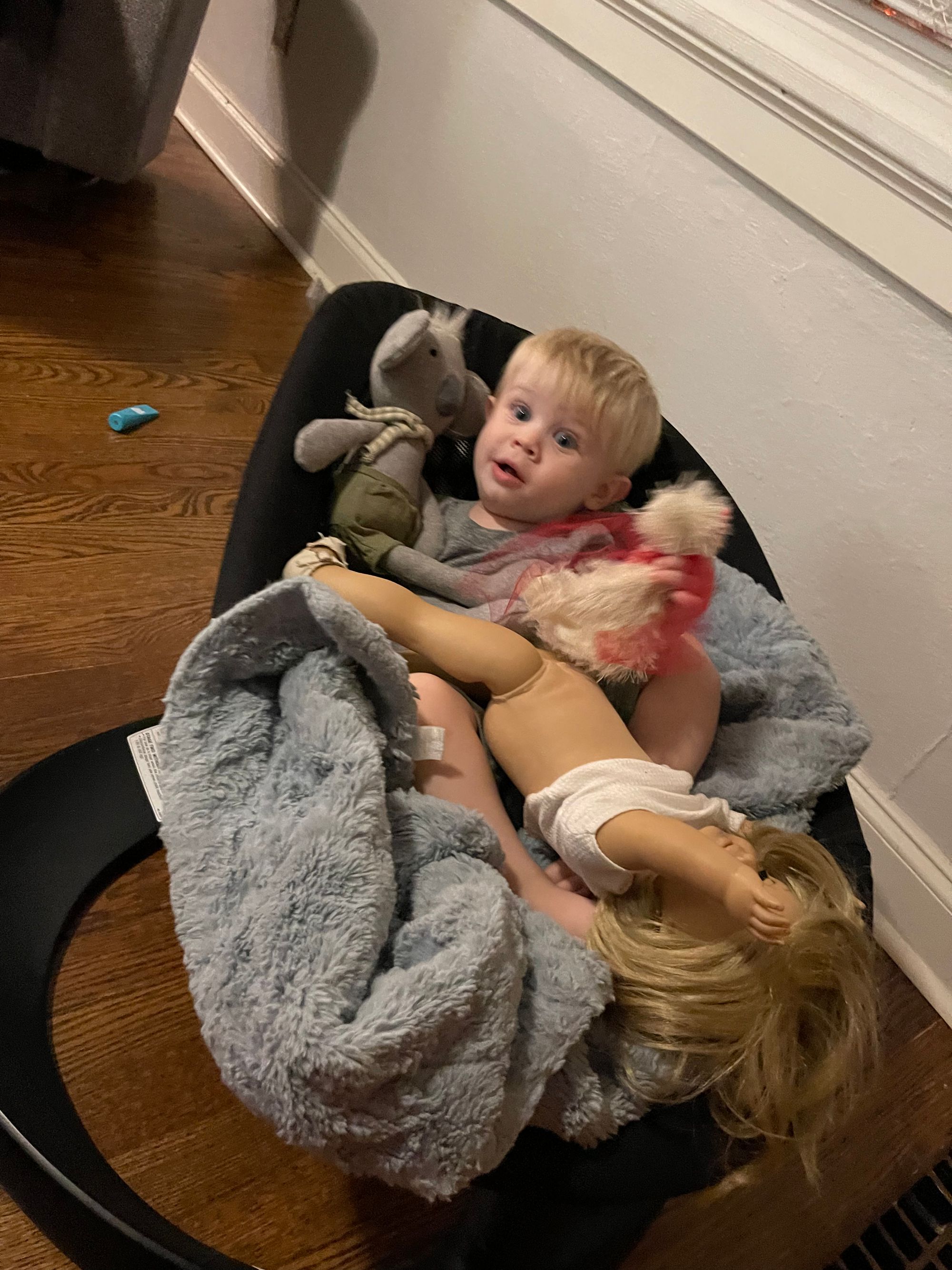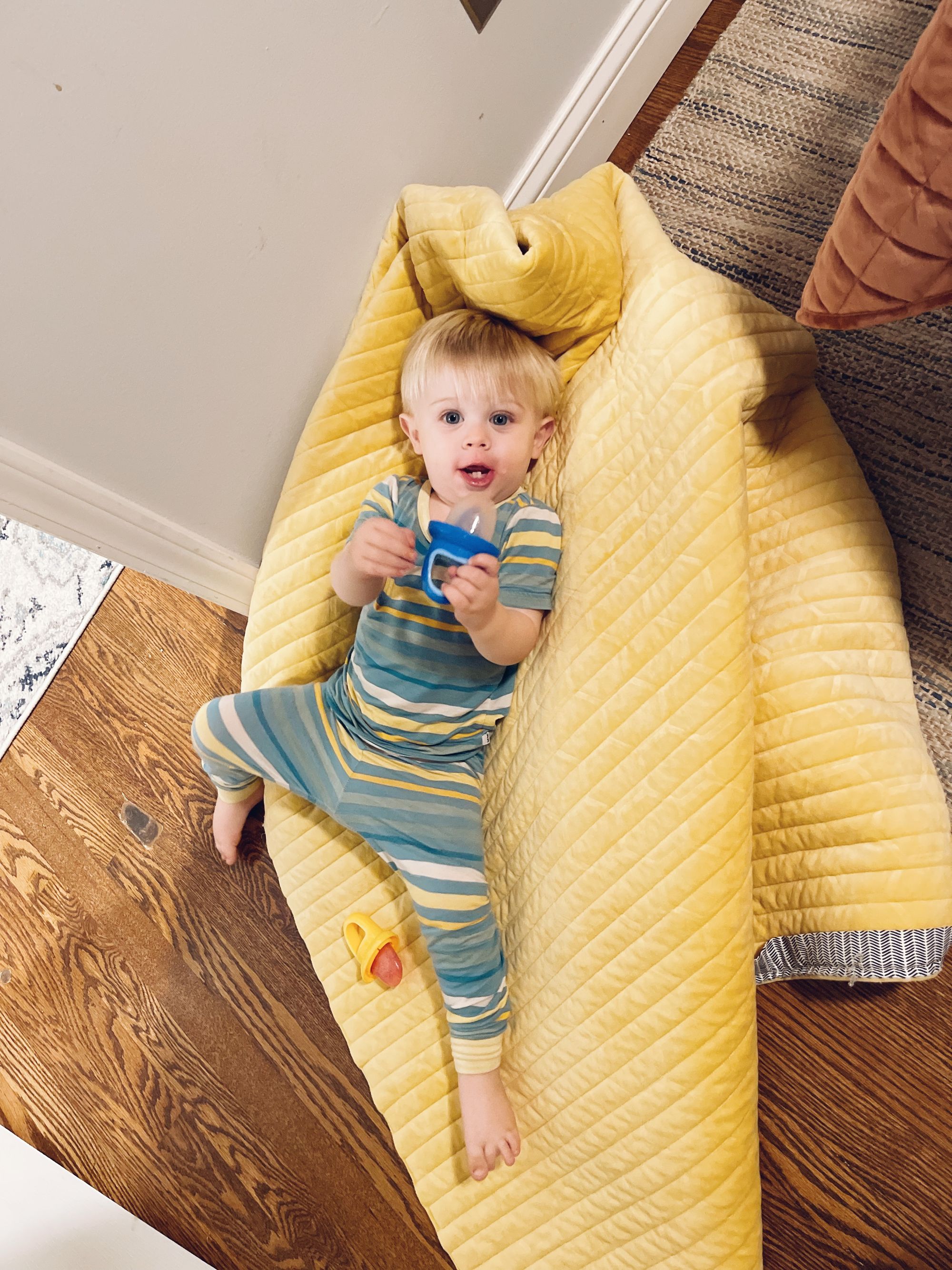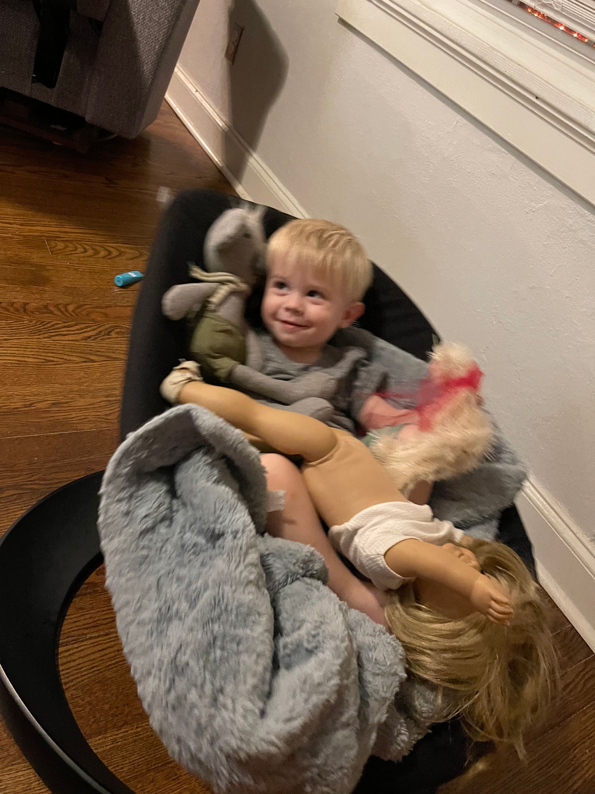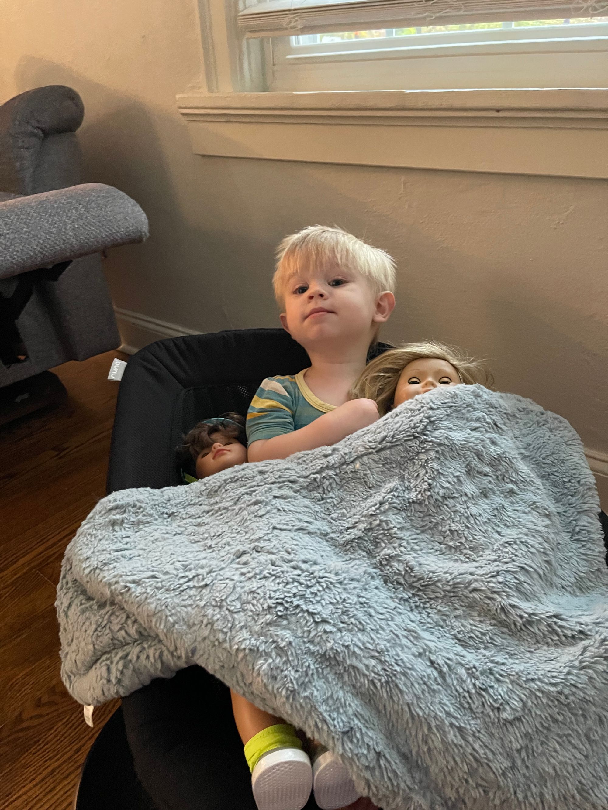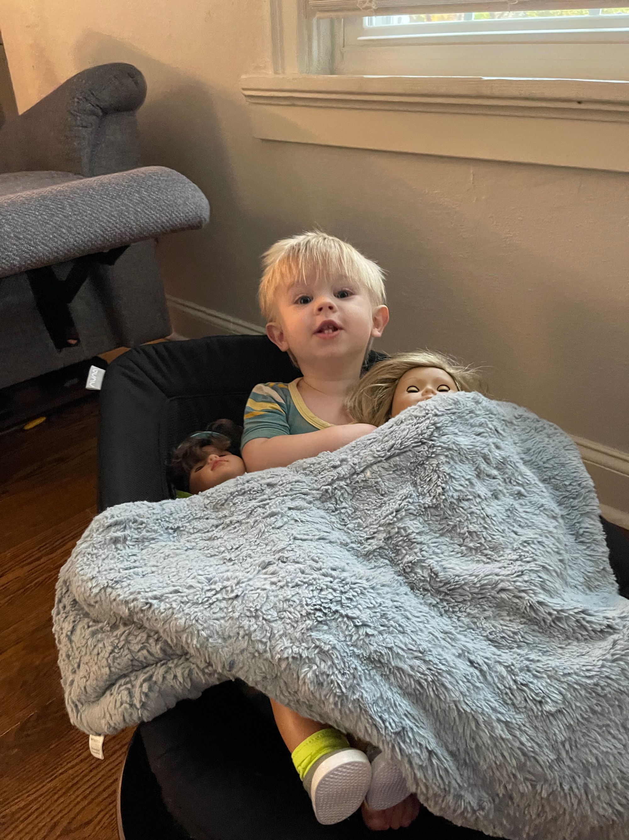 We purchased this baby swing for Benson before he was born. I love Nuna products and the fact that the Nuna Leaf has a weight limit of 130lbs made me feel like we could get a lot of use out of it! We hardly used it at all while he was a baby... and it's even crossed my mind to sell it. It's a good thing I didn't because he loves to crawl in it with his blanket and friends and snuggle. It is so cute!