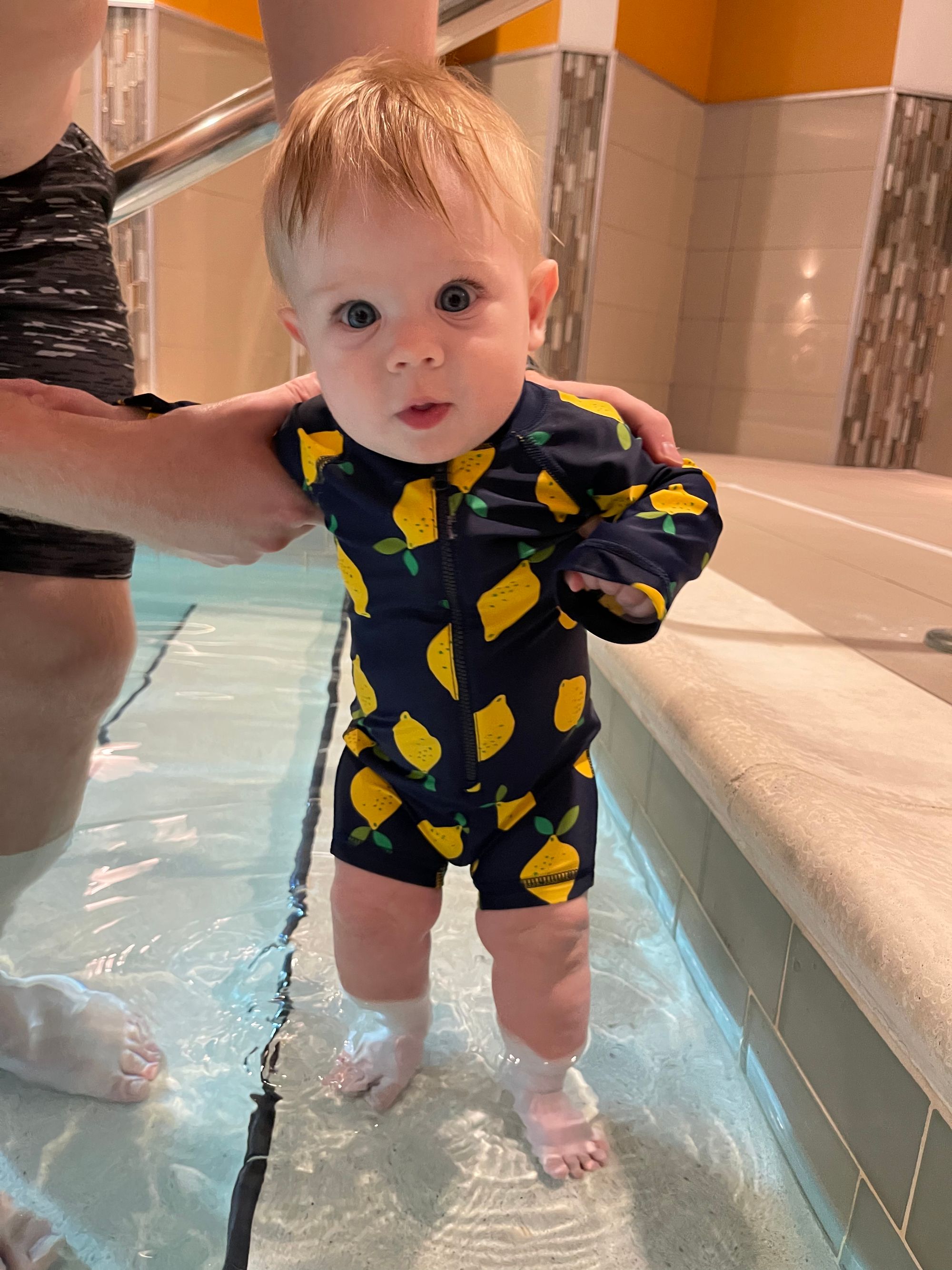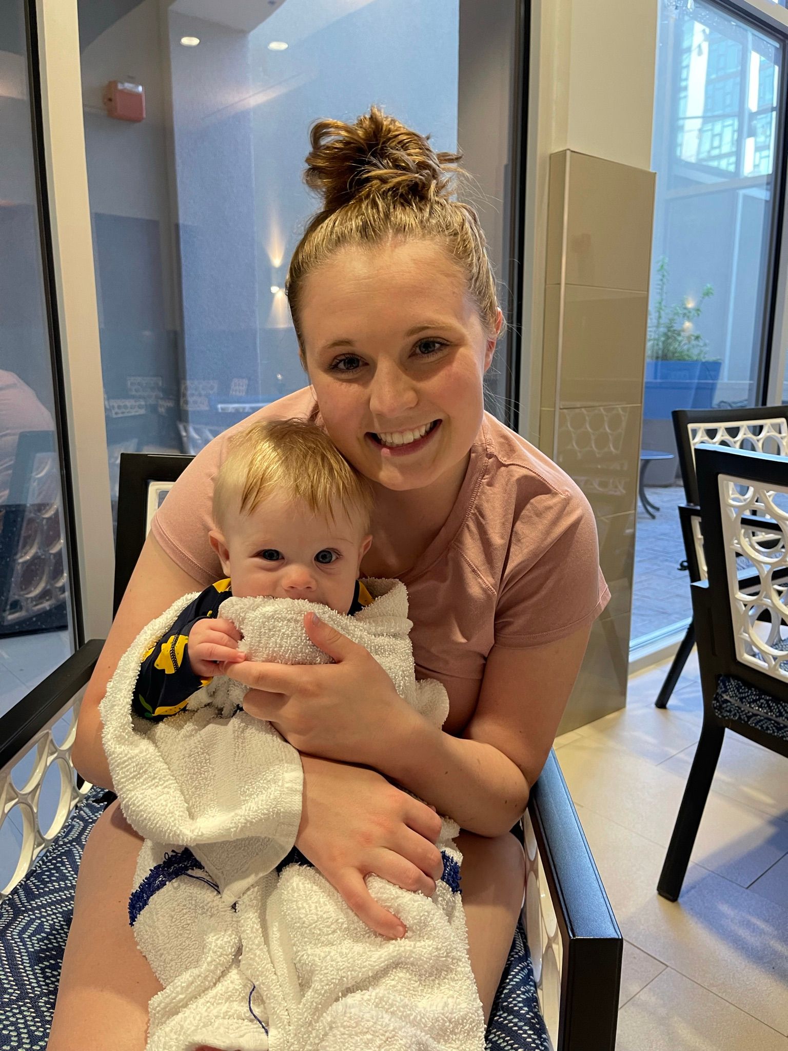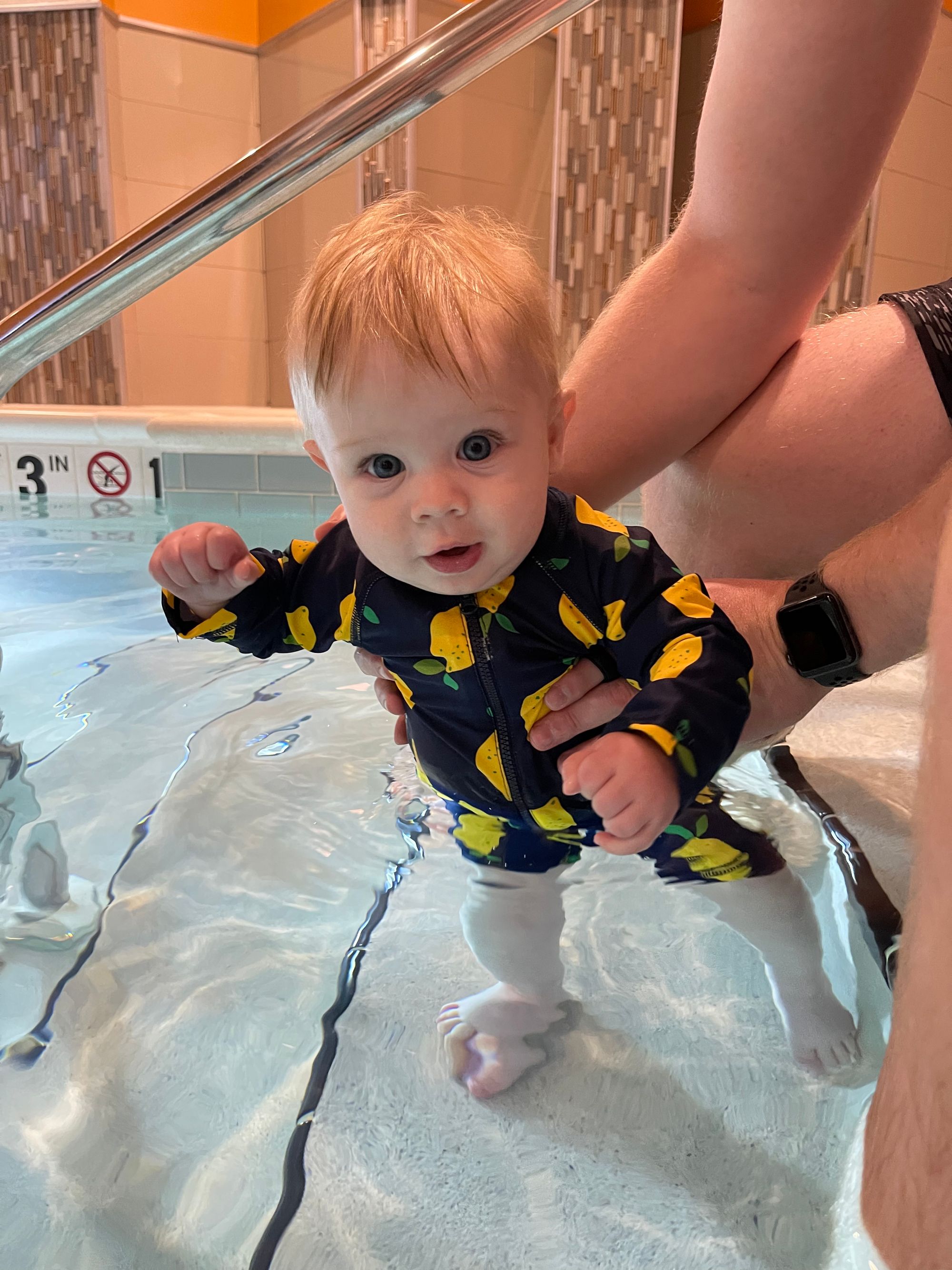 We had a few hours to kill so we checked out the swimming pool. It was freezing! This crazy boy didn't seem to mind.