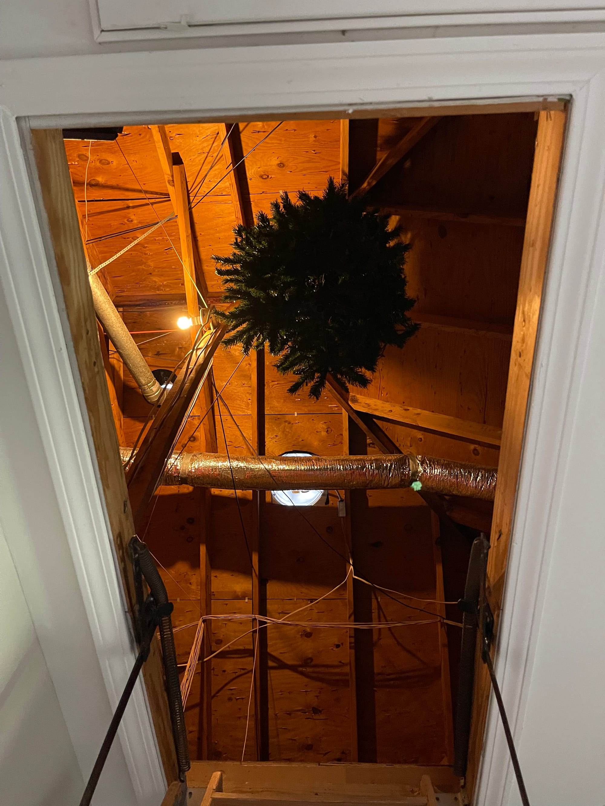 We have an attic with the built in stairs/ladder. I asked my mom to come watch benson and make sure I was good to climb up when she quickly climbed up first! I was stunned for a minute. She laughed, she’s always wanted one of these and had to be the first to try it out! We were greeted with a hanging Christmas tree?! Strange!