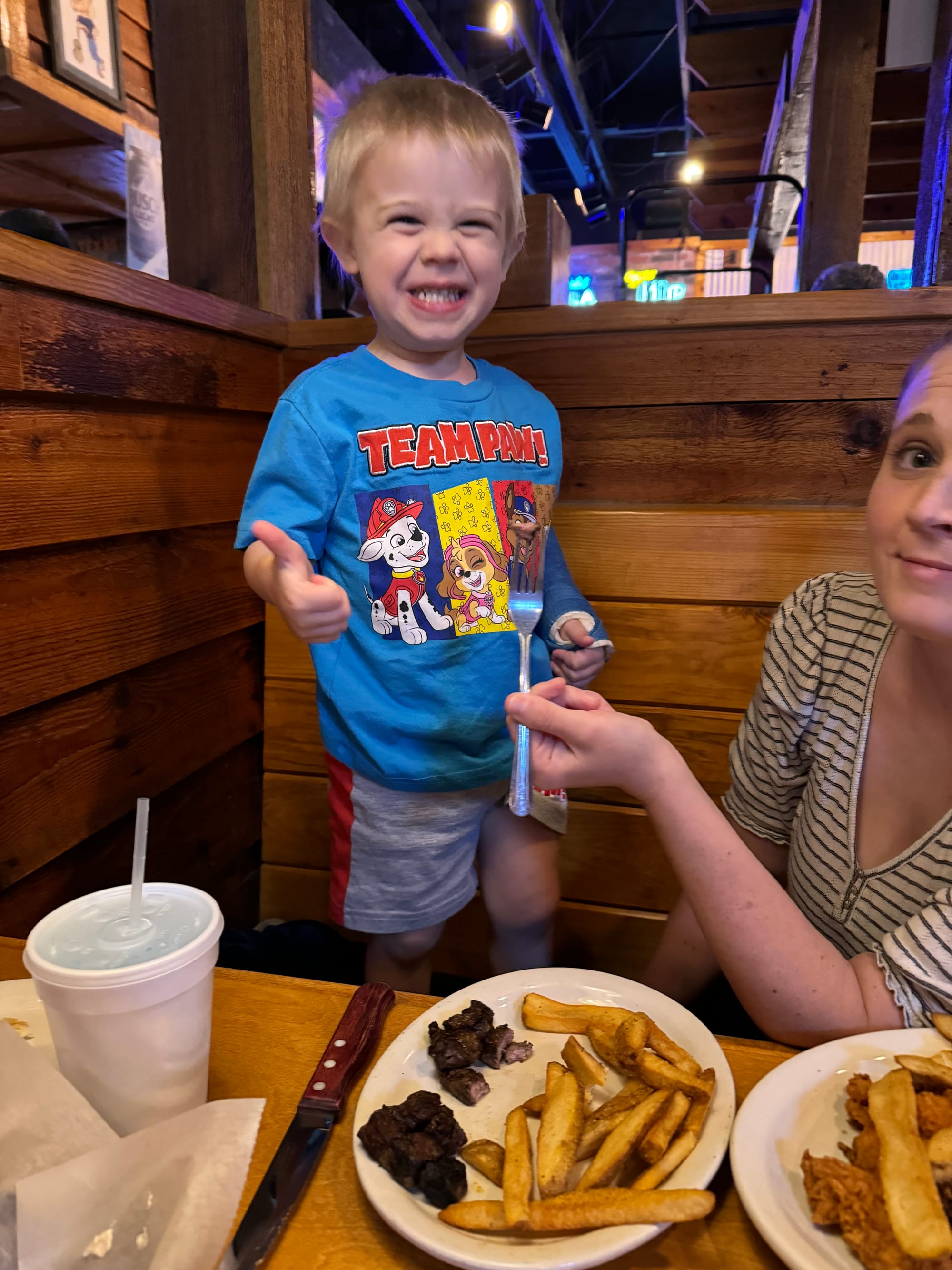 Benny has really been missing steaks from his dad! We took him to Texas road house and this steak is immediately what he pointed to…
